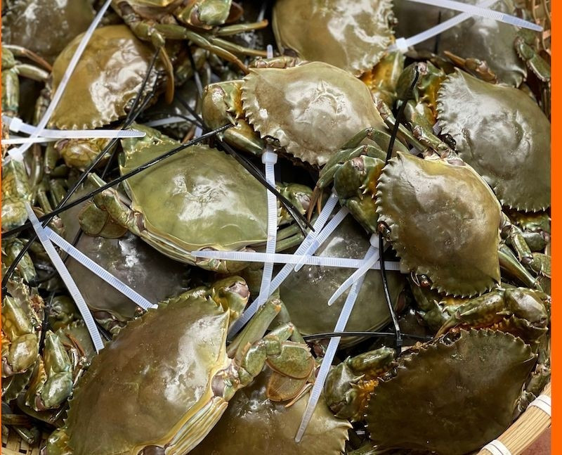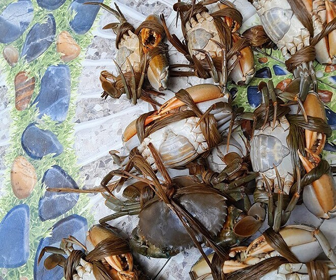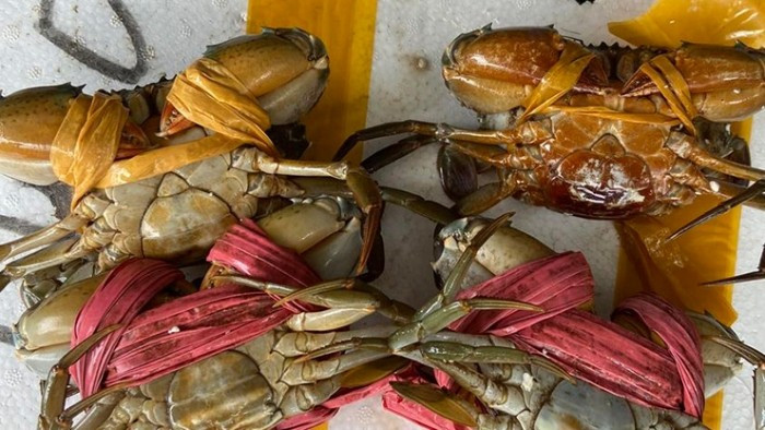 Theo kinh nghiệm của người dân địa phương, cua trinh nữ ngon là khi còn tươi rói, khỏe mạnh, có vỏ ngoài màu xám đục, yếm cua vẫn còn bám chắc vào thân, chân và càng chuyển động linh hoạt, gai trên càng và mai cua còn sắc nguyên. Ảnh: Haíanhoanglong
