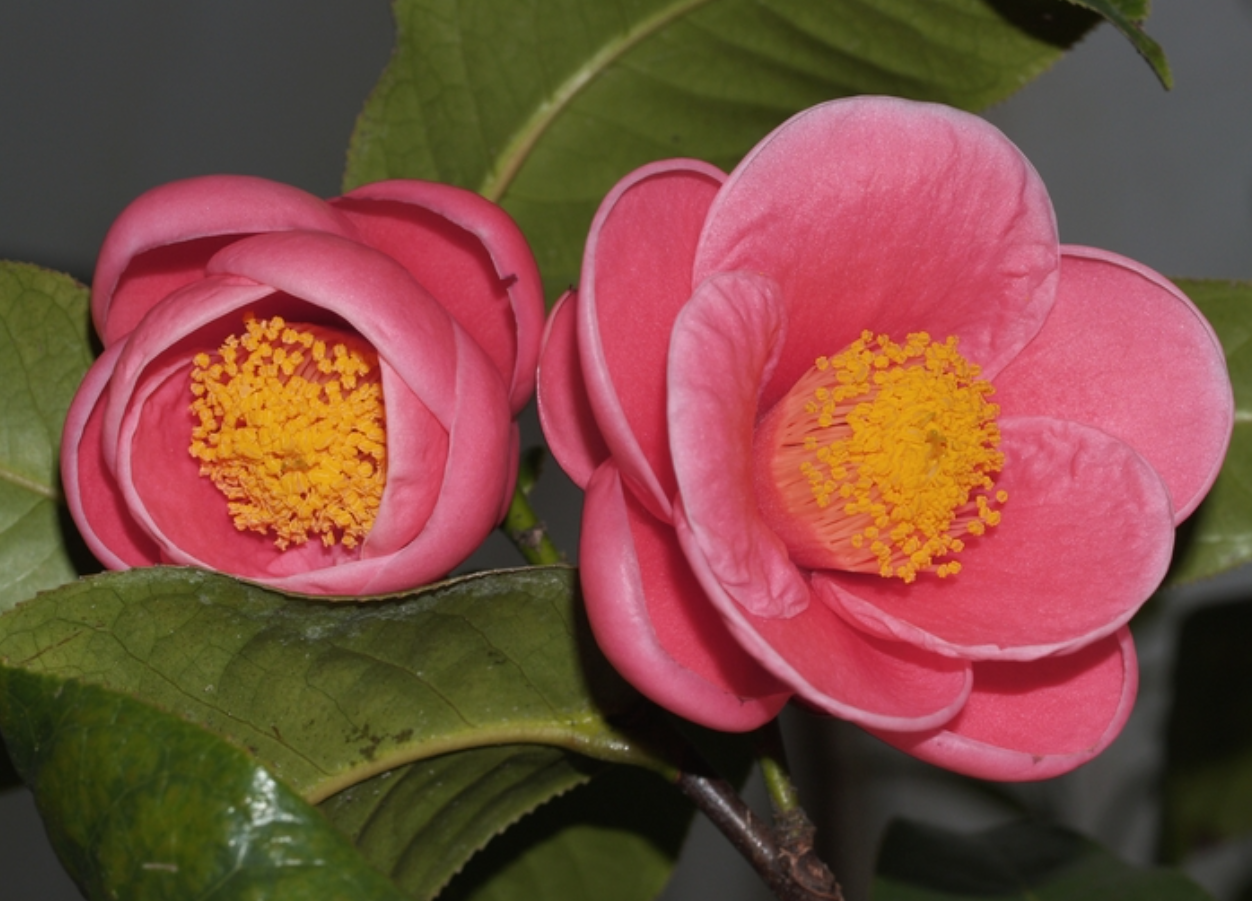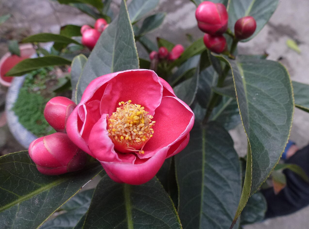 Hoa thường mọc đơn hoặc từng chùm nhỏ 1-3 bông ở đầu cành. Cánh hoa dày, mềm, xếp nhiều lớp, màu hồng đậm đến đỏ tím.