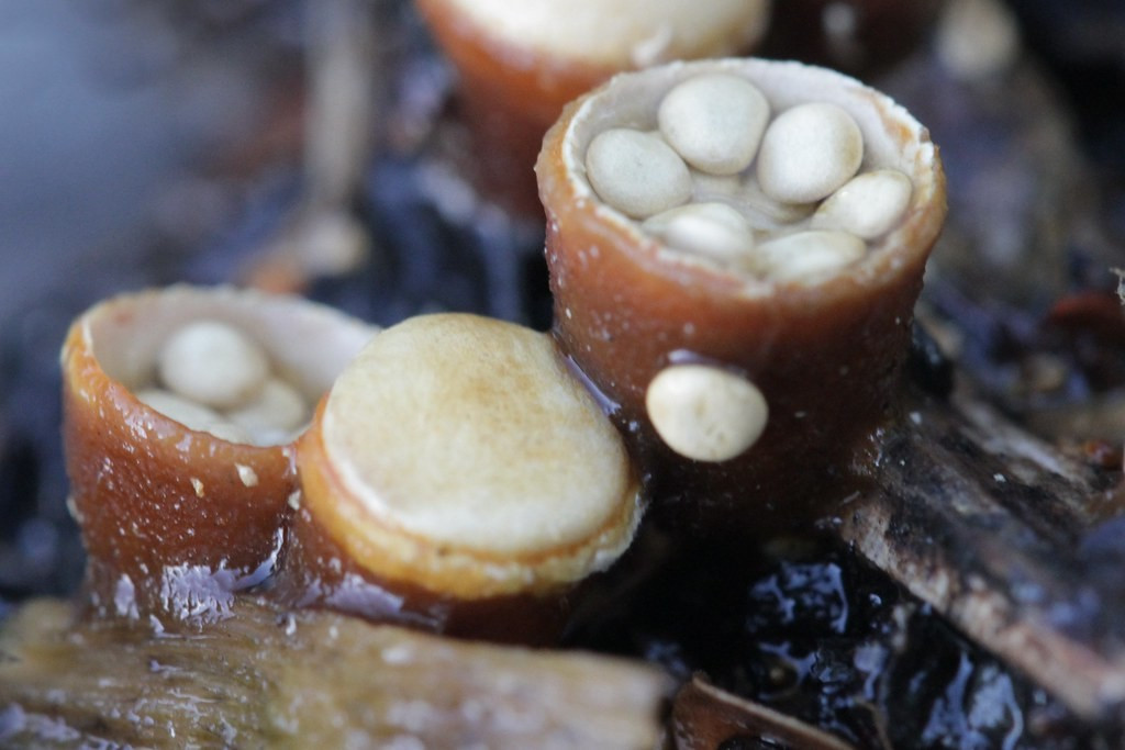 Các “trứng” của nấm thực chất là bao bào tử. Đó là những túi nhỏ chứa hàng nghìn bào tử, giúp nấm sinh sản khi nước mưa bắn tung chúng ra. Ảnh: wikimedia.org.