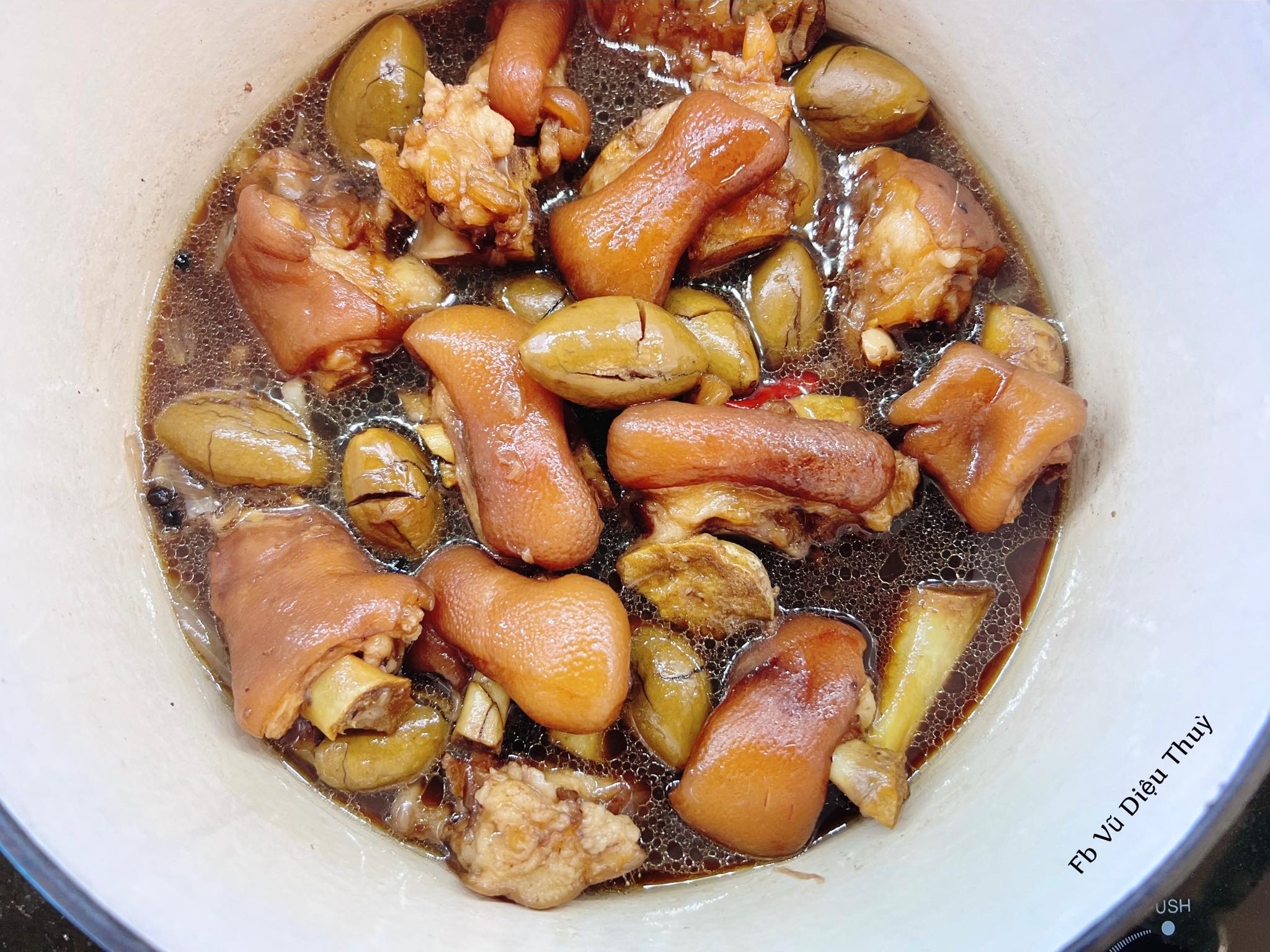 - Bước 4: Trút một bát nước nóng ngập nguyên liệu, đun trên lửa nhỏ đến khi trám và móng giò mềm là được. Bí quyết để có món móng giò ngon là kho 2 lửa.