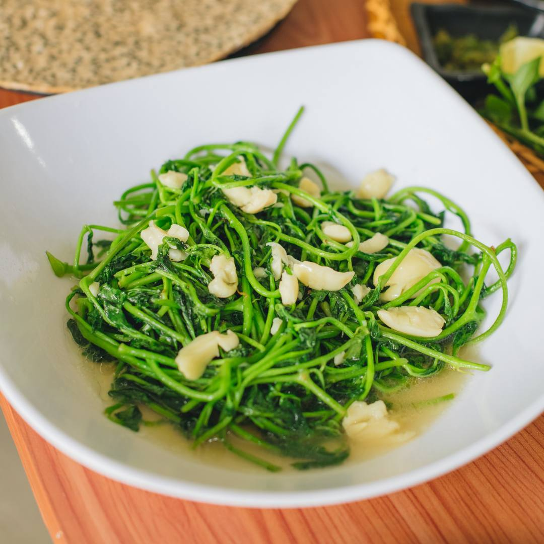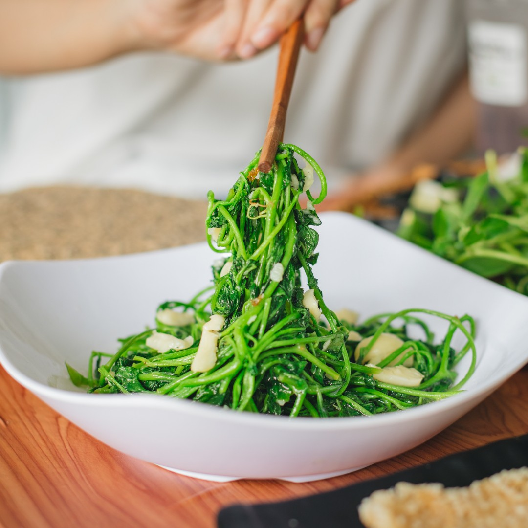 Món rau lỗ bình xào tỏi. Rau không cần trụng sơ trước khi xào nhưng vẫn giữ được độ giòn ngon và màu xanh đẹp mắt. Ảnh: Lẩu gà tháng Năm