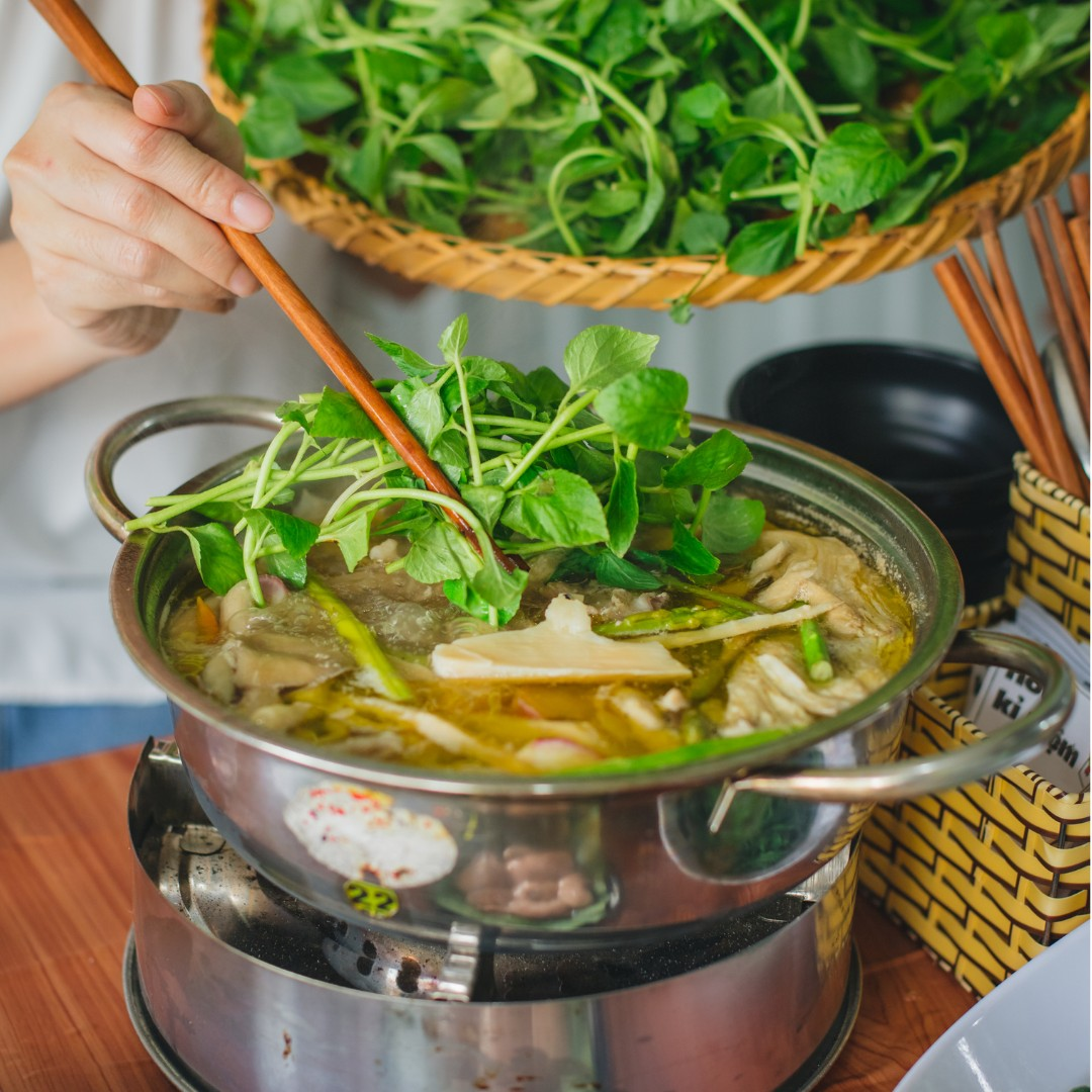 Rau lỗ bình chỉ nên nấu hoặc nhúng lẩu vừa chín tới để rau giữ được độ giòn và ngọt, tránh đun quá kỹ làm rau bị dai, ăn mất ngon. Ảnh: Lẩu gà tháng Năm
