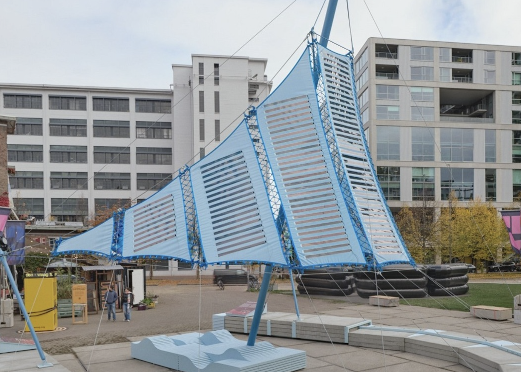 Vật liệu heliotex được mô tả là vải kiến trúc có độ bền cao, làm từ sợi polyester tái chế có khả năng chống chịu thời tiết và tia UV. Vật liệu này có thể ứng dụng linh hoạt trong các kết cấu tạm thời như lều lễ hội, mái che công cộng hay mặt dựng dệt trong kiến trúc hiện đại.