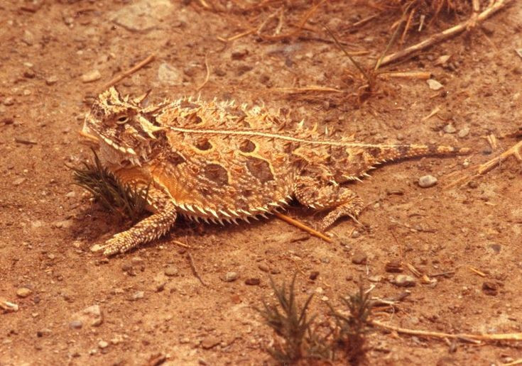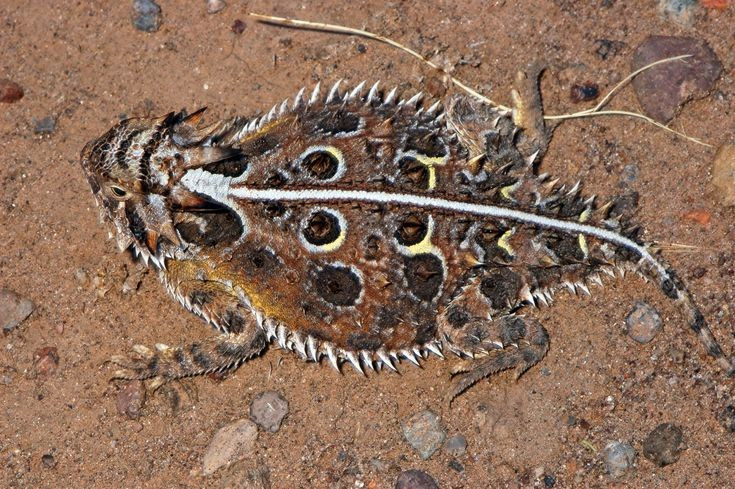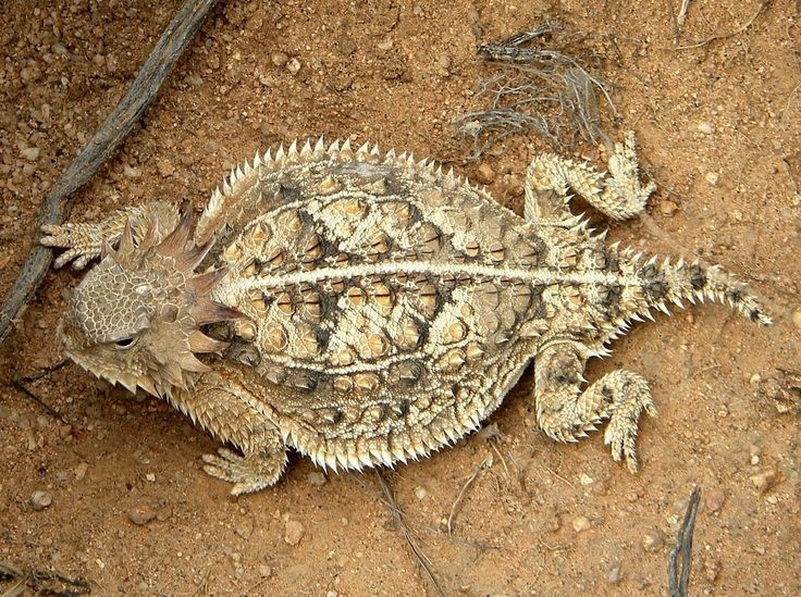 Thằn lằn sừng Texas có hình dạng giống con cóc bọc giáp. Cơ thể phẳng, tua tủa gai nhọn và đầu “có sừng” tạo vẻ ngoài đáng sợ. Ảnh: Pinterest.