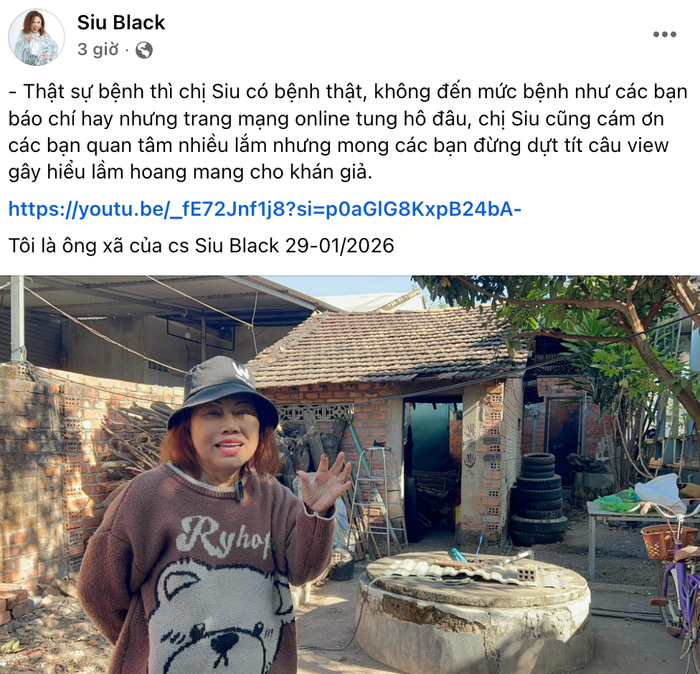 “Thật sự bệnh thì Siu Black có bệnh thật, nhưng không đến mức bệnh như các trang mạng tung hô đâu. Siu Black cảm ơn các bạn quan tâm nhiều lắm, nhưng mong mọi người đừng giật title câu view gây hiểu lầm hoang mang cho khán giả”, thông qua fanpage Siu Black, chồng nữ ca sĩ gửi lời đến khán giả.