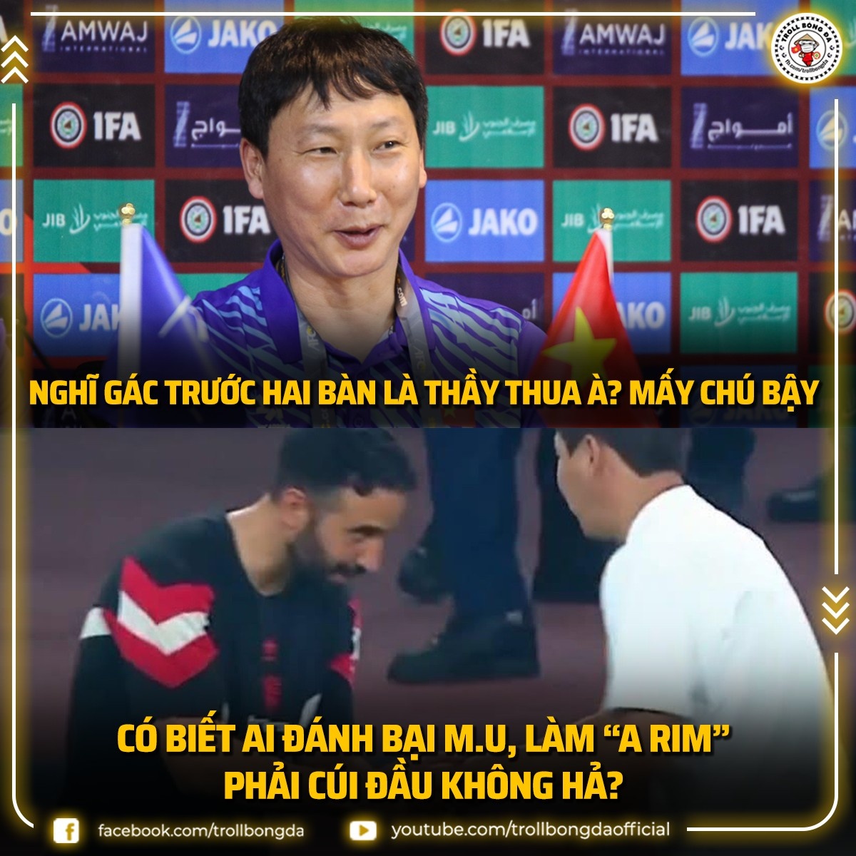 "Cú lội ngược dòng từ hiệp hai, thầy Kim quá cao tay", "Mọi người viết văn xin lỗi thầy chưa?", hay "Đá không hoa mỹ nhưng cuối giải vẫn nâng cúp",... là một số bình luận xuất hiện trên các nền tảng mạng xã hội. Nhiều người còn hài hước chia sẻ lại bức hình Ruben Amorim cúi đầu bắt tay HLV Kim Sang Sik sau trận giao hữu giữa Manchester United và đội các ngôi sao Đông Nam Á hồi tháng 5. Ảnh: Troll Bóng Đá/Facebook.