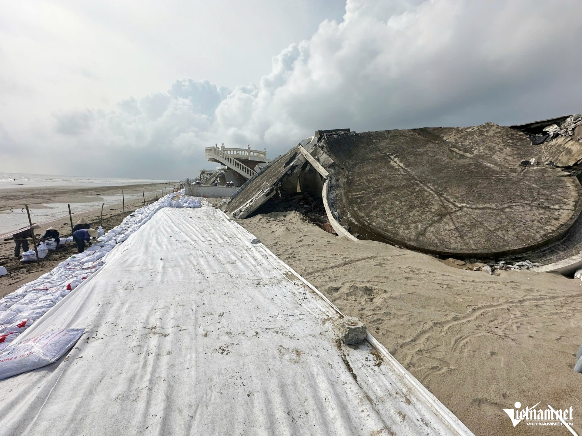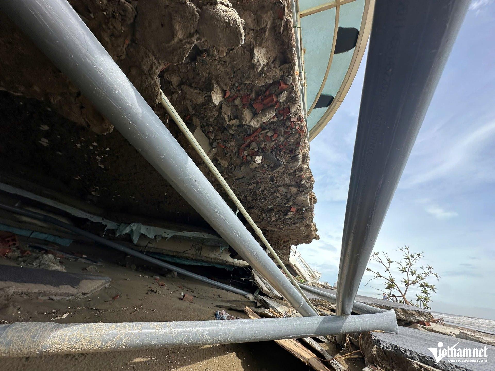 Móng biệt thự bị bão xô trồi lên khỏi mặt cát.
