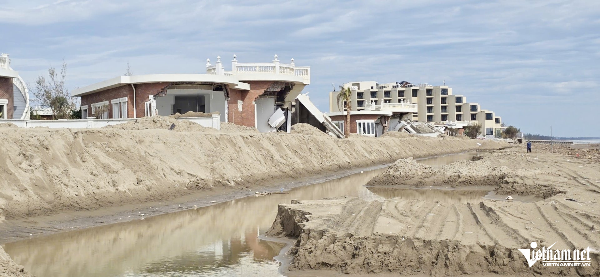 Đáng chú ý, trong khi phần lớn các villa sát biển bị sóng đánh sập và trơ móng, chỉ có hai căn villa sát tòa khách sạn Mường Thanh gần như còn nguyên vẹn. Theo quan sát, hai căn này được xây hệ thống bê tông cốt thép dày, có chức năng như kè chắn sóng.