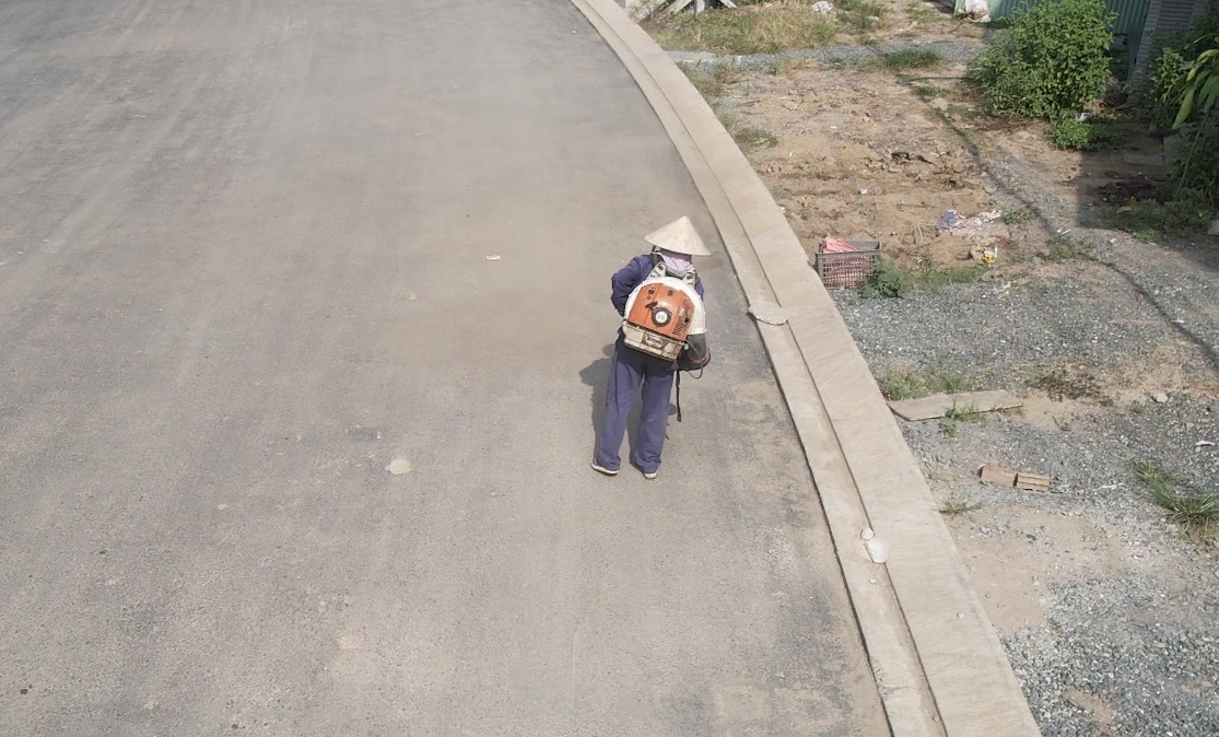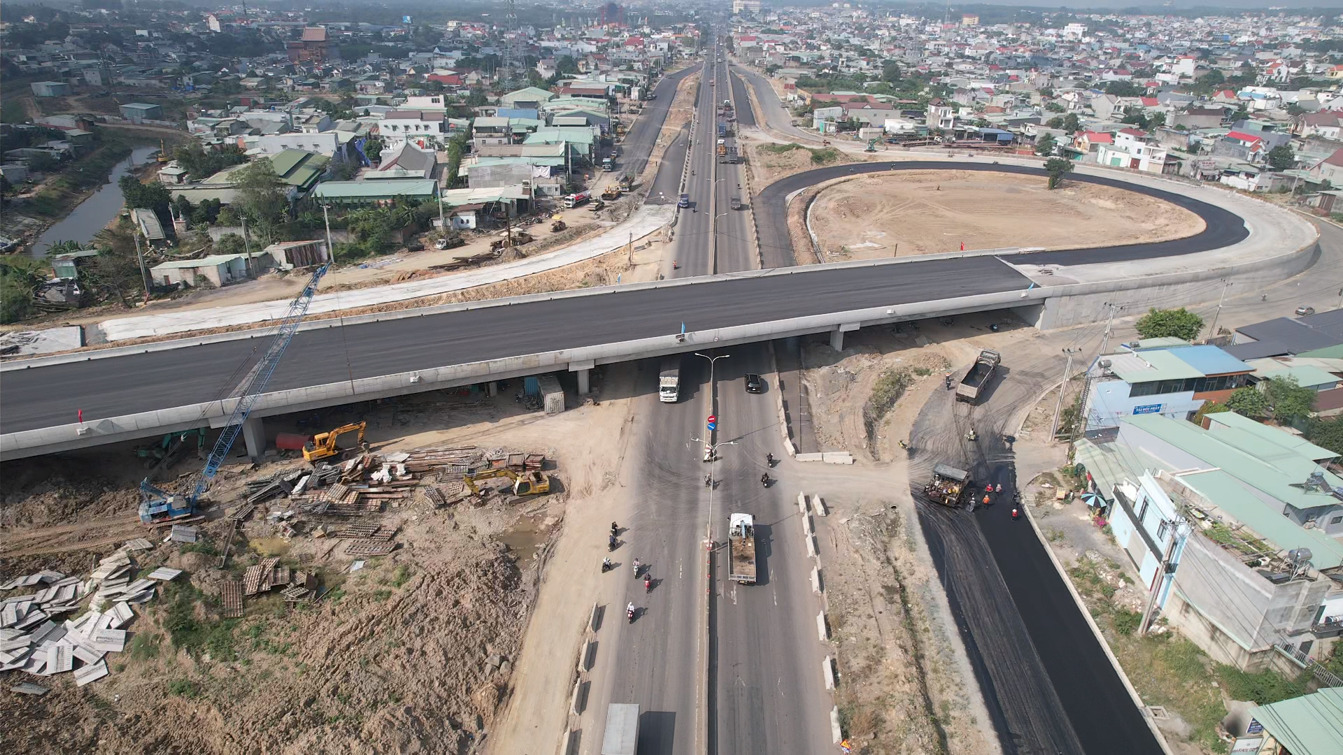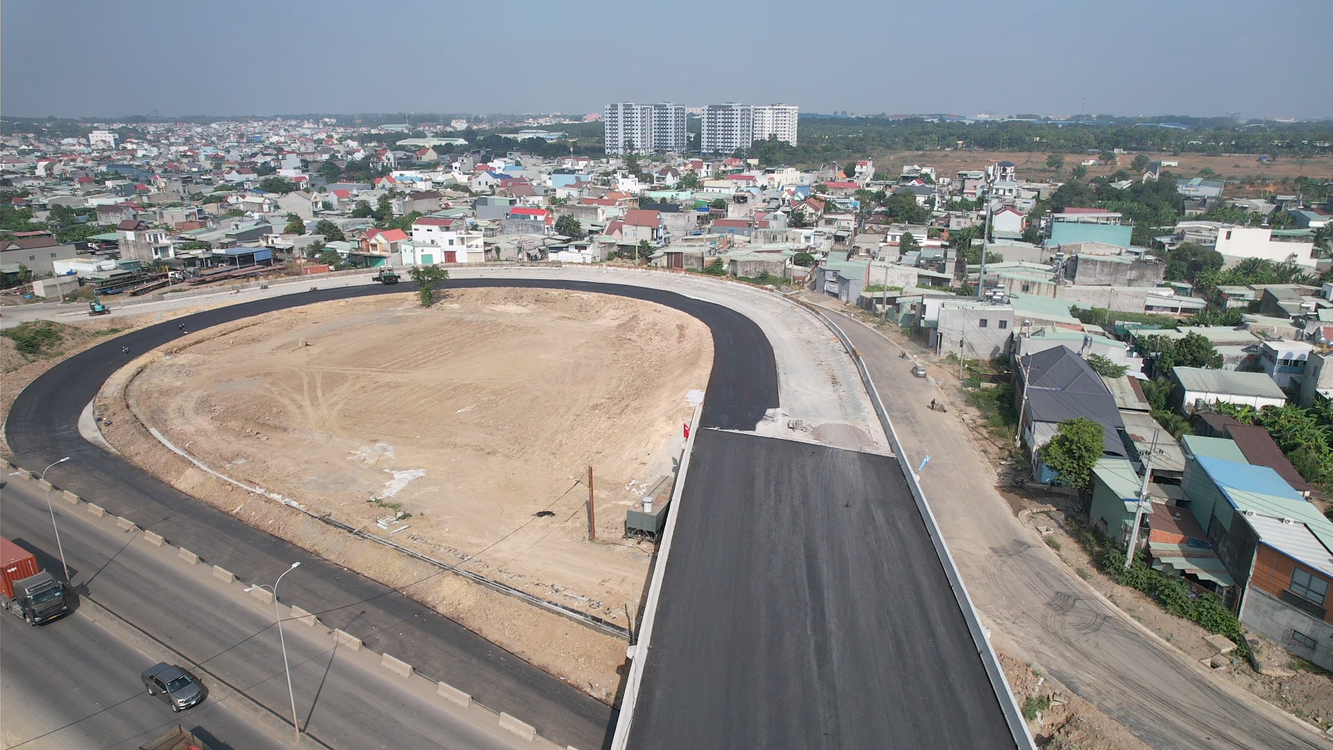 Tại đoạn qua phường Phước Tân, lực lượng thi công tập trung hoàn thiện nền đường khu vực đầu tuyến và cầu vượt nút giao Võ Nguyên Giáp. Những xe thảm nhựa, xe chuyên dụng cùng đội ngũ kỹ sư, công nhân làm việc nhộn nhịp, từng lớp nhựa được trải đều trên mặt đường. Ngay cạnh đó, một nhóm công nhân khẩn trương làm sạch bề mặt, thổi bụi, chuẩn bị cho công đoạn thảm nhựa tại nút giao.