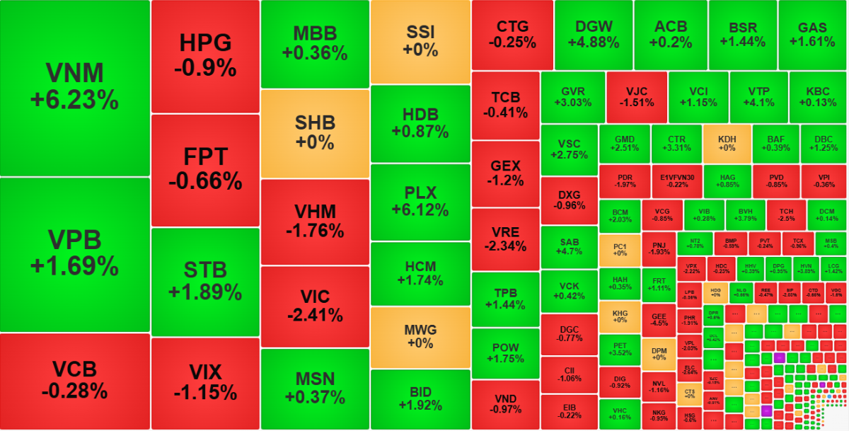 Một điểm tích cực là thanh khoản vẫn đang tập trung tốt hơn ở nhóm cổ phiếu tăng giá, chiếm 53,1% sàn HoSE trong khi phía giảm chiếm 37,8%. Nhóm 82 cổ phiếu tăng tốt nhất cũng chiếm 38,3% thanh khoản. Tới 16 cổ phiếu trong nhóm này đạt giao dịch vượt trăm tỷ đồng, bao gồm cả các mã tầm trung như HCM tăng 1,74%, DGW tăng 4,98%, BSR tăng 1,68%, POW tăng 1,75%, VCI tăng 1,15%, VTP tăng 4,18%, VSC tăng 2,52%.