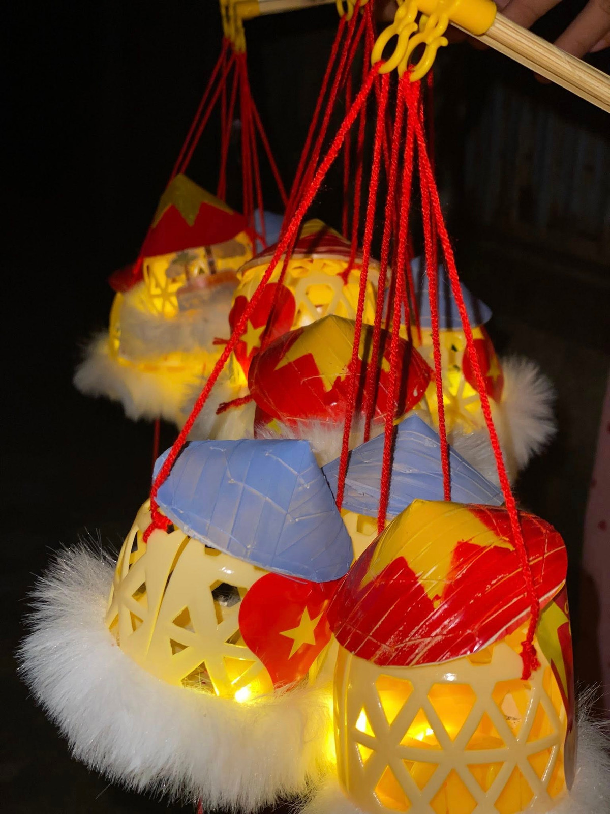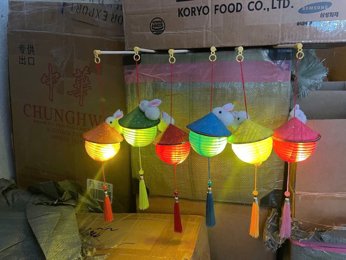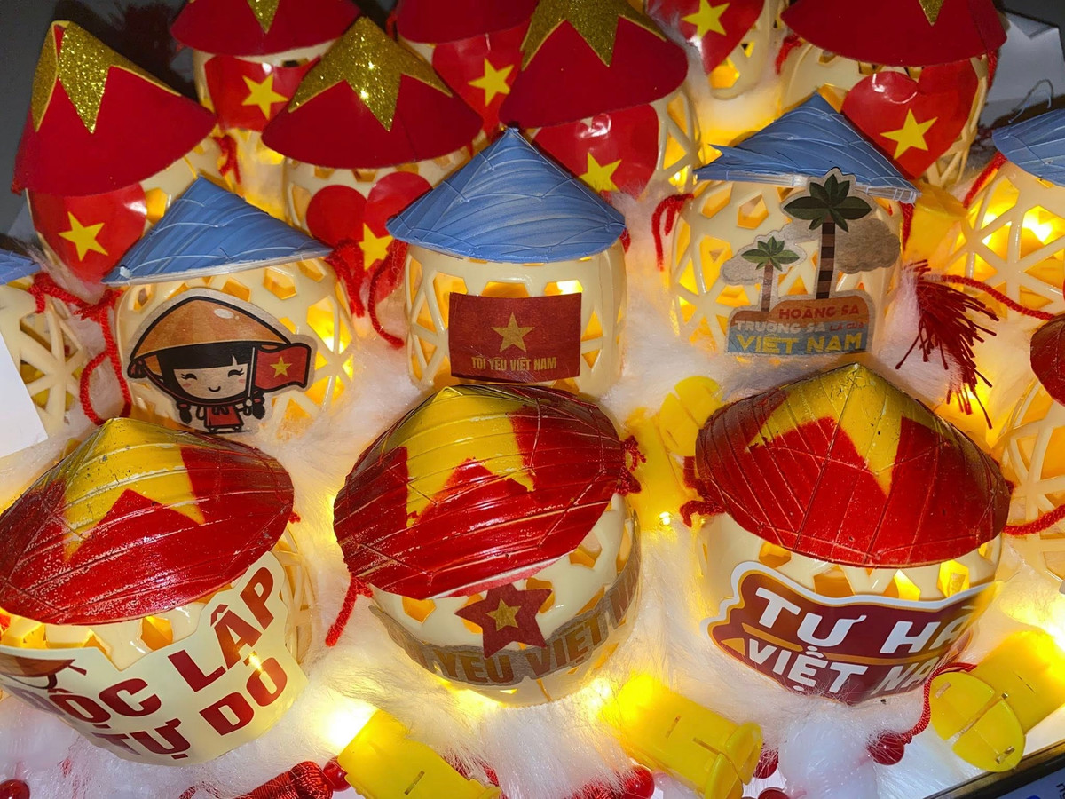 Cụ thể, phần chao đèn được làm thành hình nón, phối màu rực rỡ với họa tiết cờ Việt Nam, có khi còn gắn thêm thú bông nhỏ xinh như thỏ trắng