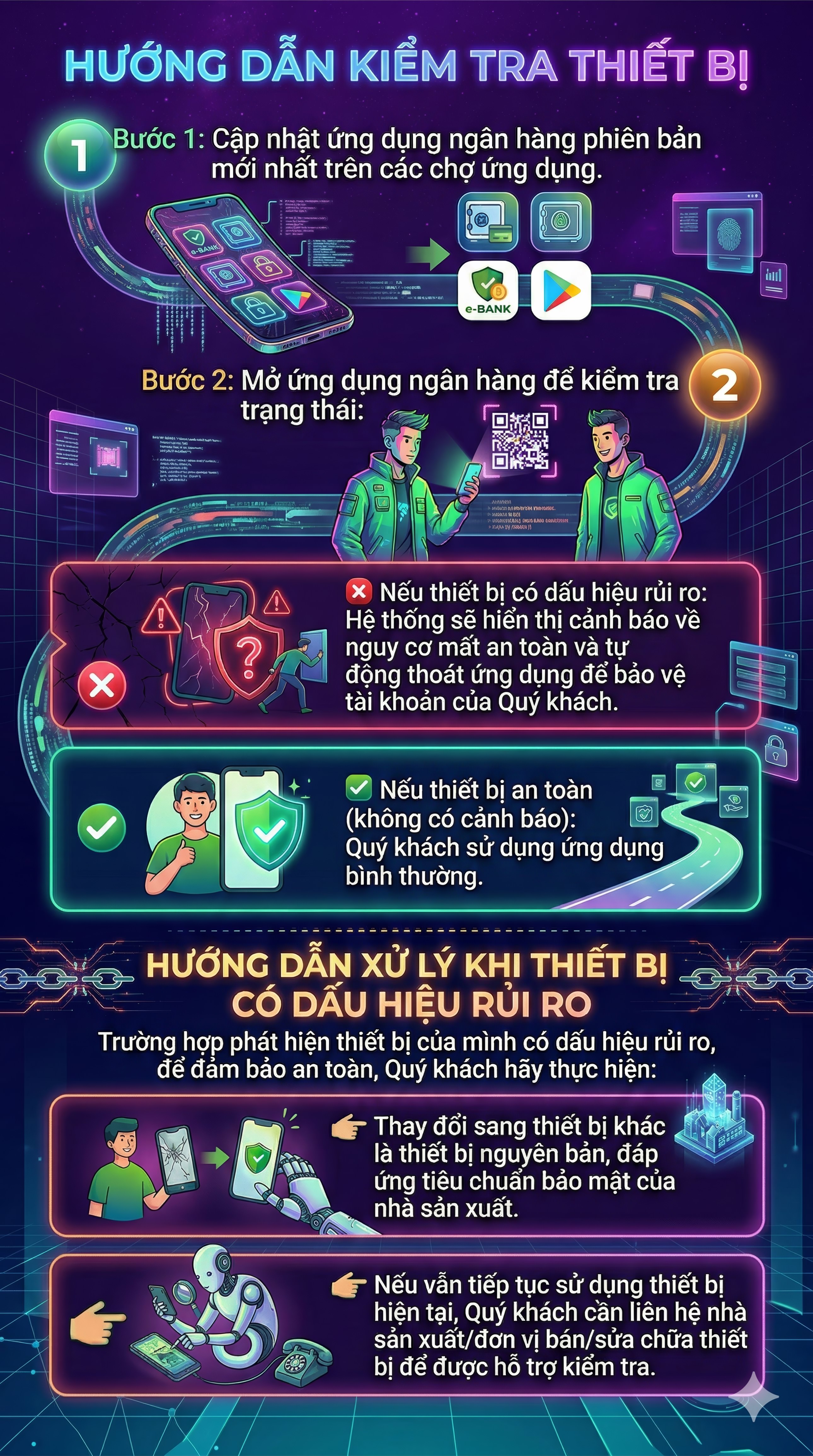 Việc rà soát định kỳ nhằm phát hiện sớm lỗ hổng kỹ thuật, nguy cơ bị cài mã độc hoặc bị khai thác trái phép trước khi gây thiệt hại cho khách hàng. Đồng thời, ứng dụng phải được thiết kế để tự động dừng hoạt động ngay khi phát hiện thiết bị nằm trong nhóm rủi ro.