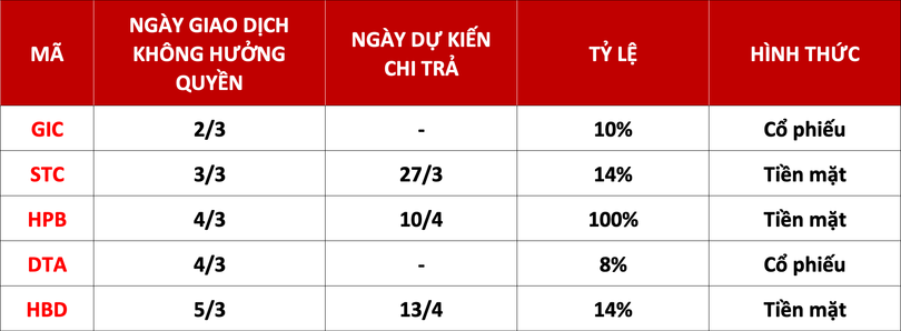 CTCP Bao bì PP (Mã: HPB) chốt 5/3 là ngày đăng ký cuối cùng để tạm ứng cổ tức bằng tiền năm 2025, tỷ lệ 100% (1 cổ phiếu nhận 10.000 đồng). Ngày giao dịch không hưởng quyền là 4/3, thời gian thanh toán dự kiến là 10/4.