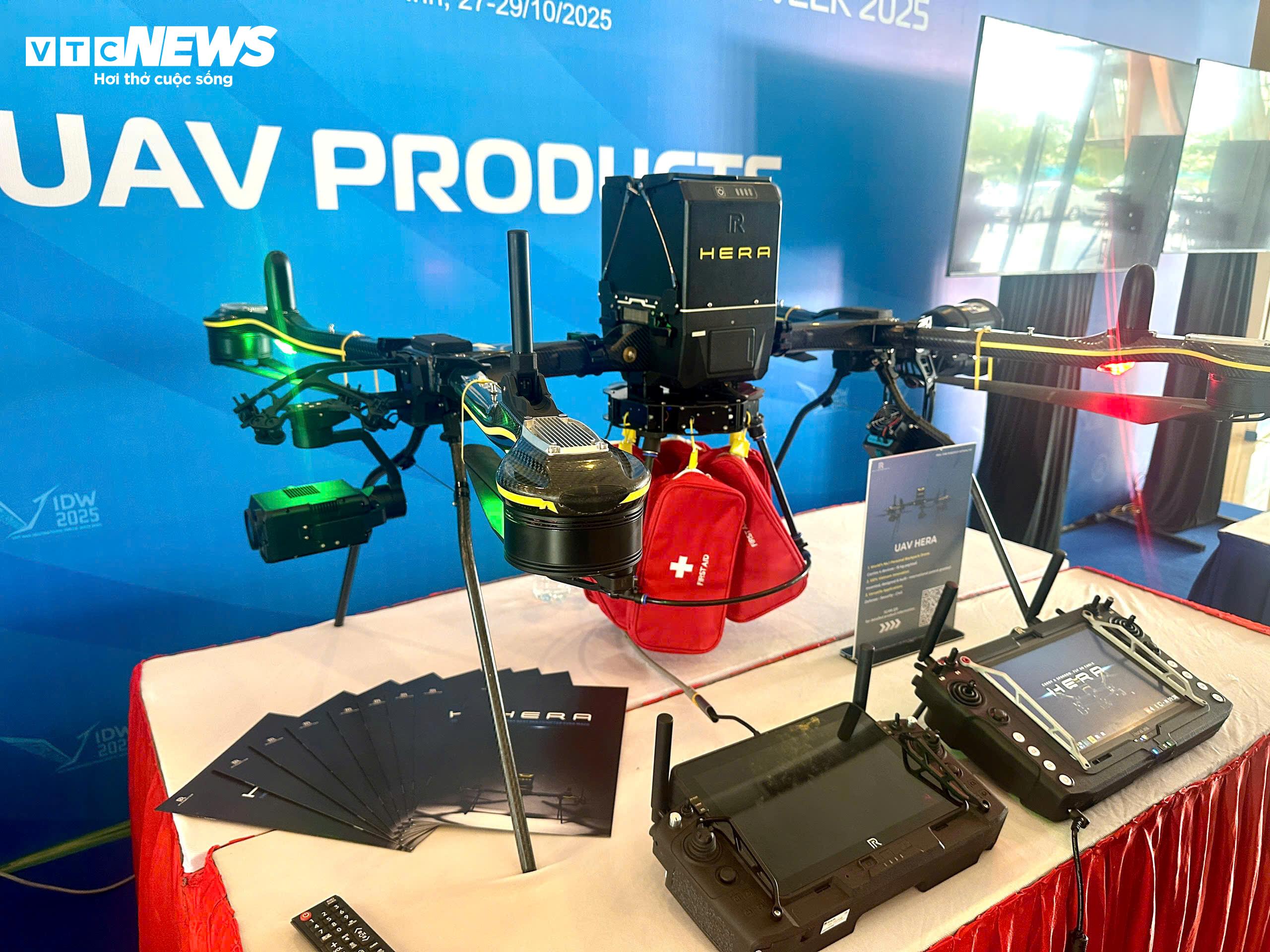 Drone Hera là một sản phẩm do người Việt Nam nghiên cứu và phát triển, đã nhận được sự đánh giá cao từ quốc tế và có mặt tại khu trưng bày sản phẩm hôm nay.