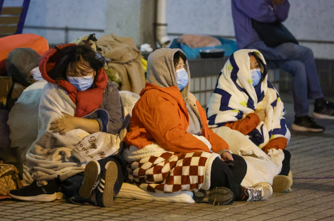 Người thân của những nạn nhân trong vụ cháy đang ngồi đợi tin tức. (Ảnh: Dickson Lee)