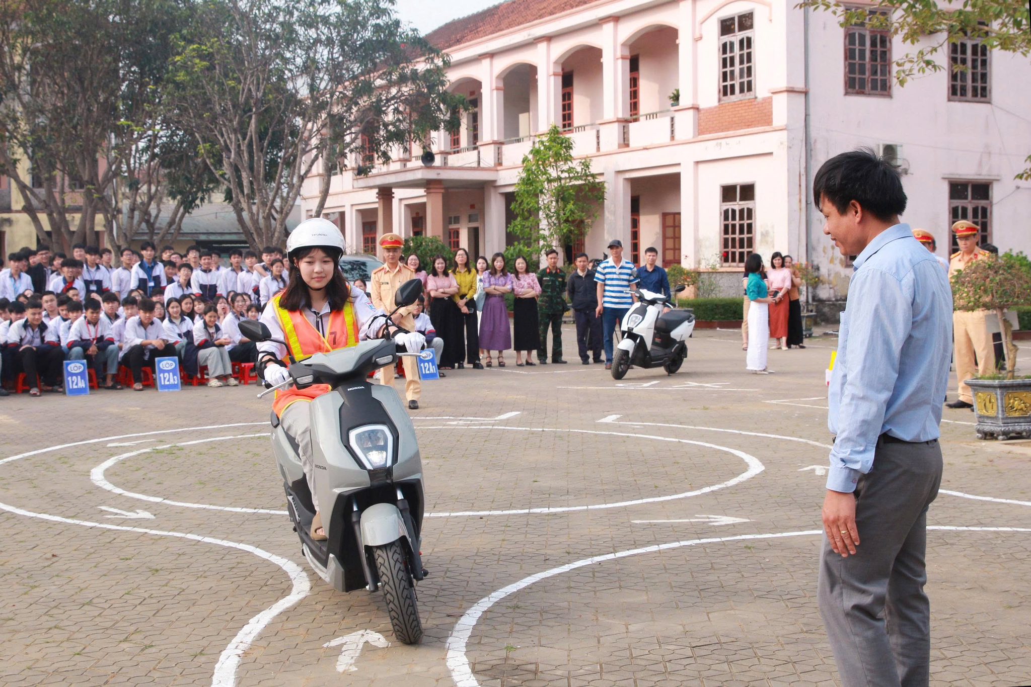 Theo Thượng tá Thắng, trong các chương trình tuyên truyền, lực lượng CSGT không chỉ phổ biến luật mà còn phối hợp với trung tâm sát hạch, doanh nghiệp như Honda để hướng dẫn học sinh thực hành lái xe trên sa hình, tư thế điều khiển và quy trình vận hành an toàn.