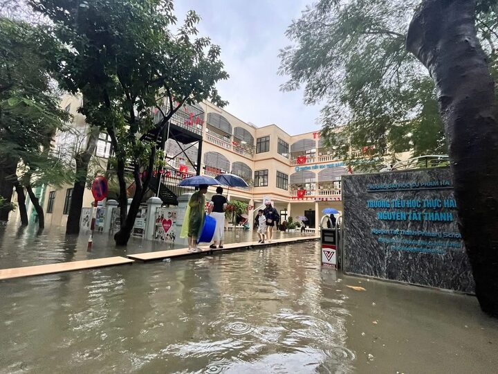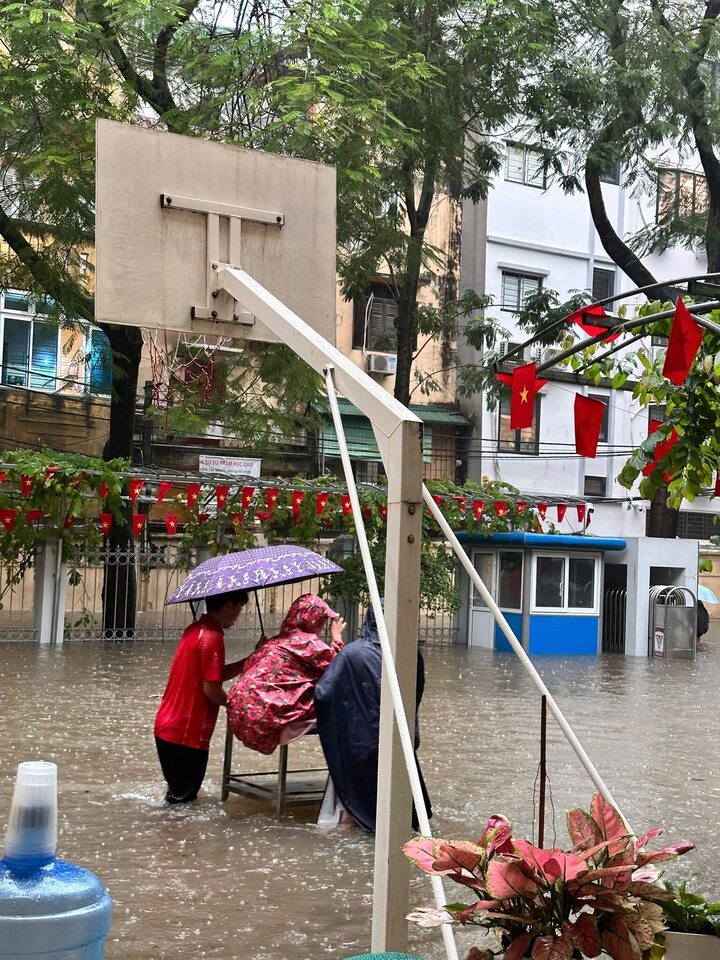 Nhiều trường học ở Hà Nội ngập nặng sau những trận mưa lớn liên tiếp; hình ảnh các thầy cô giáo xoay xở để đưa học sinh ra về được chia sẻ lên mạng gây xúc động. Khi sân trường biến thành sông, những chiếc bàn học nhanh chóng được xếp nối lại cầu dã chiến để học sinh có thể bước đi an toàn, không phải lội trong nước bẩn.