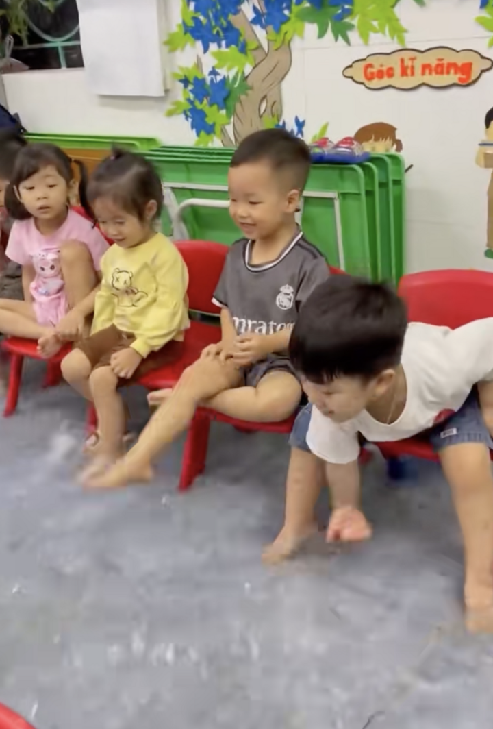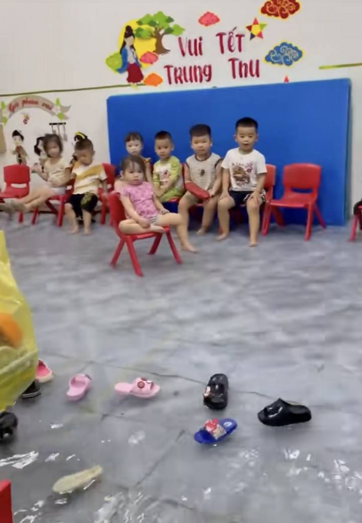 Tại một trường mầm non tư thục, nước bất ngờ tràn vào khiến sàn ngập lênh láng. Cô giáo vẫn bình tĩnh, kiên trì đứng lớp và hướng dẫn các em nhỏ, không hề nao núng trước hoàn cảnh. Các bé vẫn ngồi ngay ngắn trên ghế, lắng nghe và làm theo hiệu lệnh của cô. Một vài em thích thú nghịch nước, vô tư vỗ tay, té nước tung tóe, tạo nên khung cảnh vừa hài hước vừa cảm động.