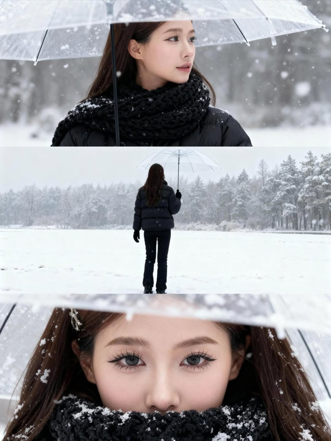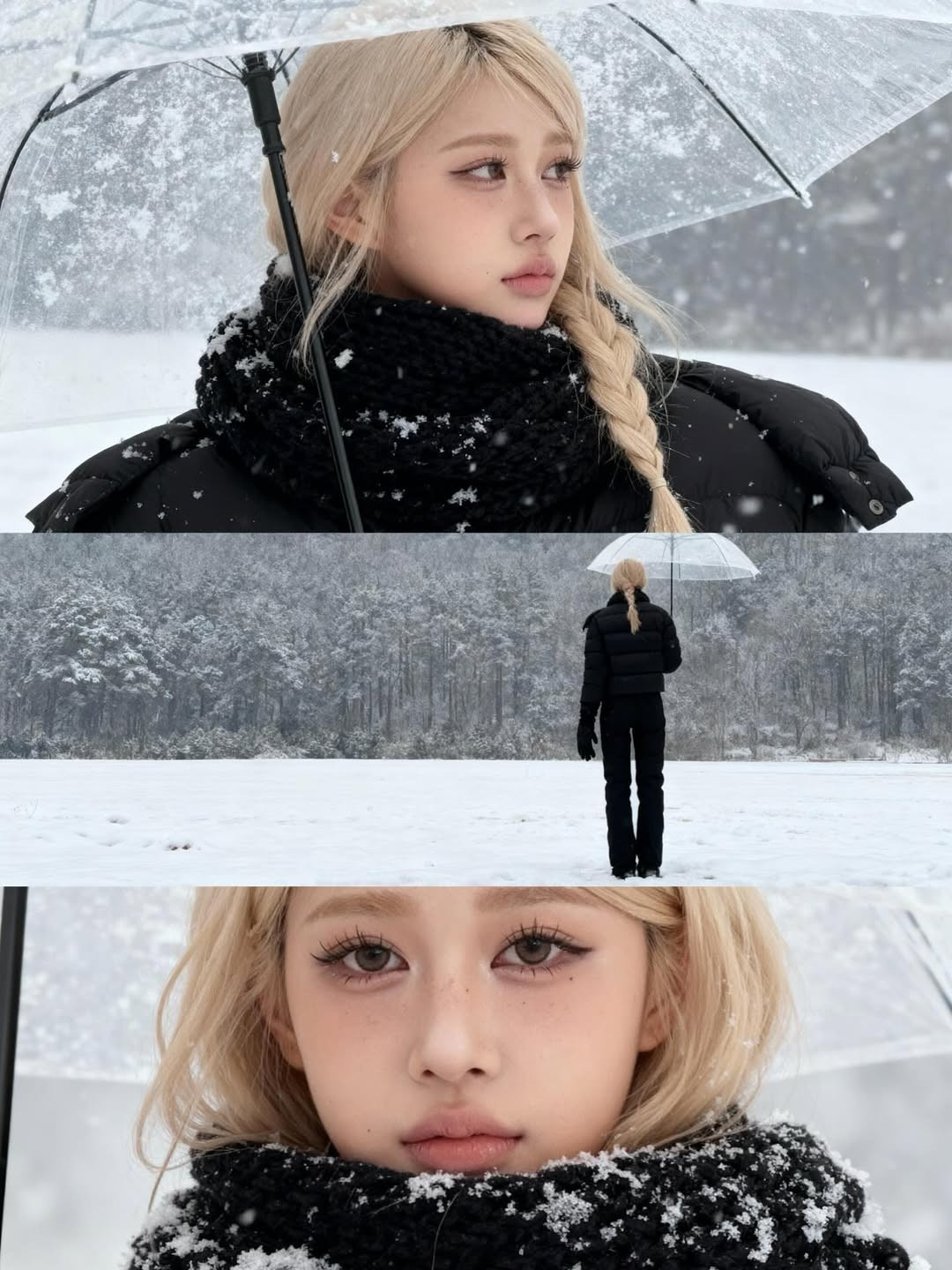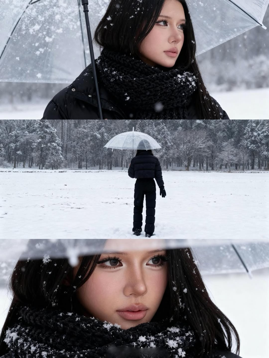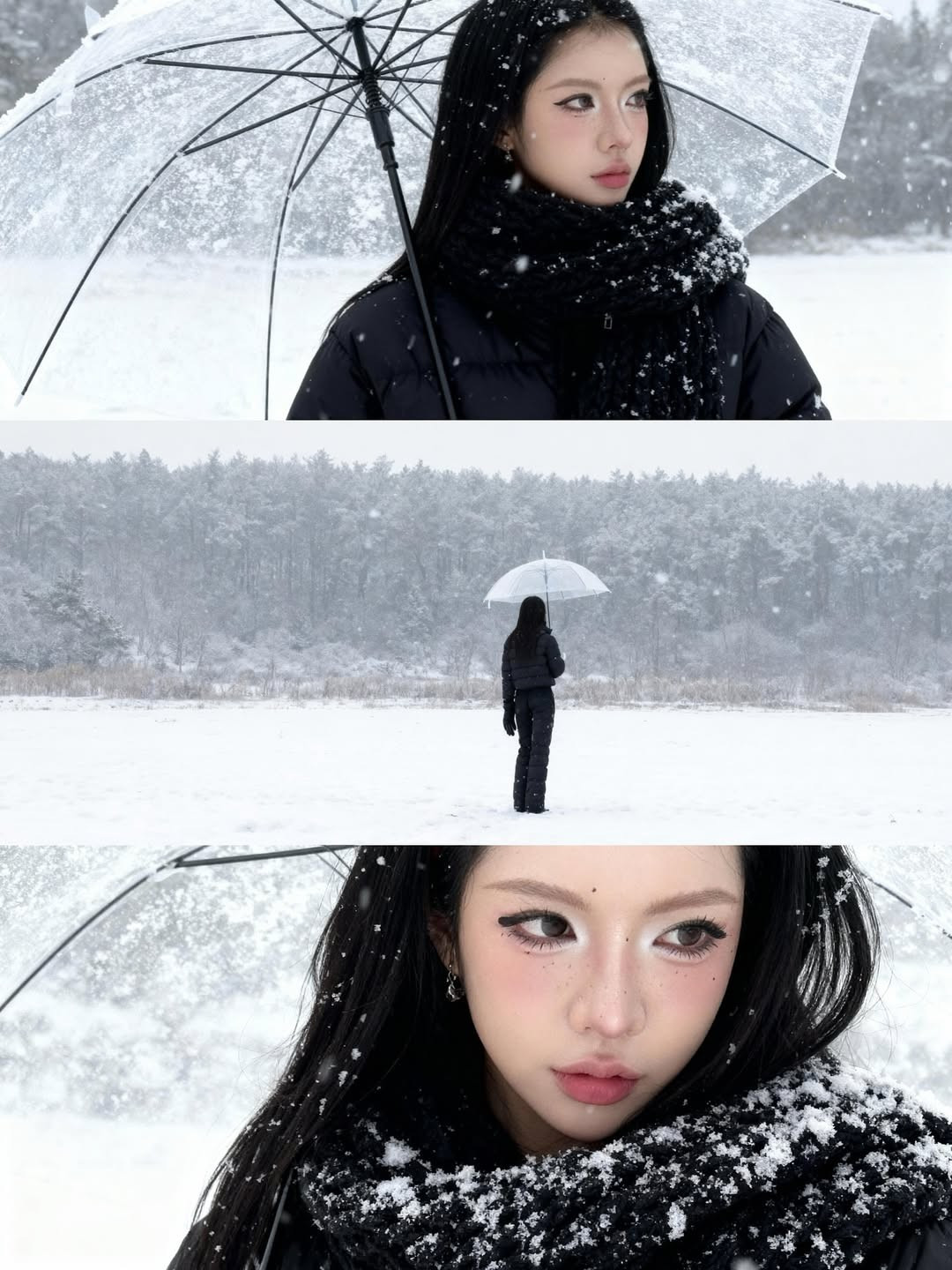 Khung cảnh tuyết trắng, cây thông mờ ảo cùng chiếc ô trong suốt đã tạo nên một bối cảnh đậm chất điện ảnh. (Ảnh: IG @louispham203)