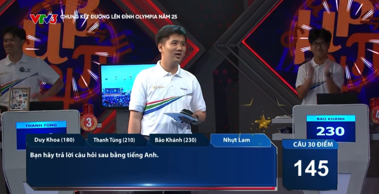Phần thi Về đích của cũng là một trong những khoảnh khắc ấn tượng nhất trong trận Chung kết. Khi trả lời câu hỏi tiếng Anh, nam sinh đến từ THPT Cái Bè (Đồng Tháp) đã đưa ra phần dịch chuẩn xác đến từng từ, đầy đủ các chi tiết.