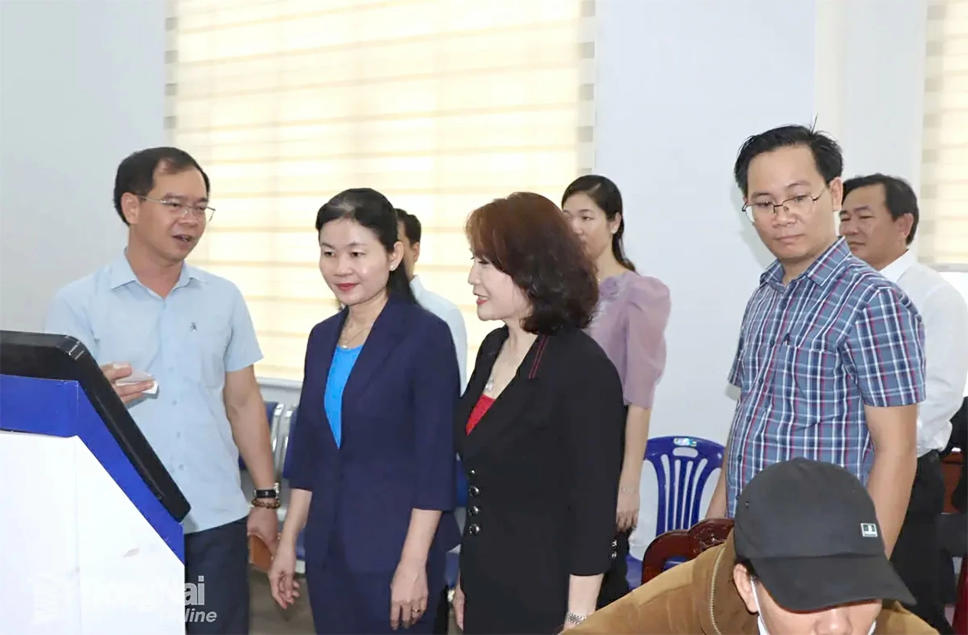 Ủy viên Ban Chấp hành Trung ương Đảng, Phó bí thư thường trực Tỉnh ủy, Chủ tịch HĐND tỉnh Tôn Ngọc Hạnh thăm và khảo sát tình hình hoạt động tại Trung tâm Phục vụ hành chính công xã Xuân Lộc. Ảnh: ĐPCC