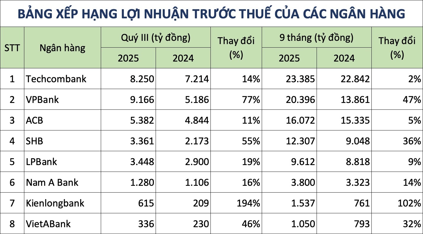 Lũy kế 9 tháng đầu năm, ngân hàng ghi nhận 23.835 tỷ đồng lợi nhuận trước thuế, tăng hơn 2% so với cùng kỳ. Như vậy, Techcombank cũng là đơn vị ghi nhận lợi nhuận 9 tháng cao nhất.
