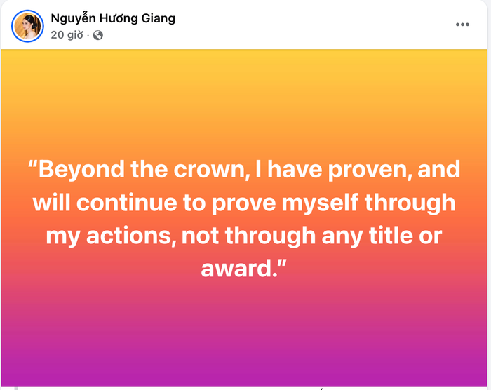 Thông điệp trên mang dấu ấn rất Hương Giang - kiên định, bản lĩnh và không phụ thuộc vào danh hiệu. Dù không có mặt trong Top 3 Beyond The Crown hay Top 30 chung cuộc, Hương Giang khẳng định sẽ tiếp tục theo đuổi các dự án cộng đồng và chứng minh giá trị của mình bằng đóng góp thực tế.