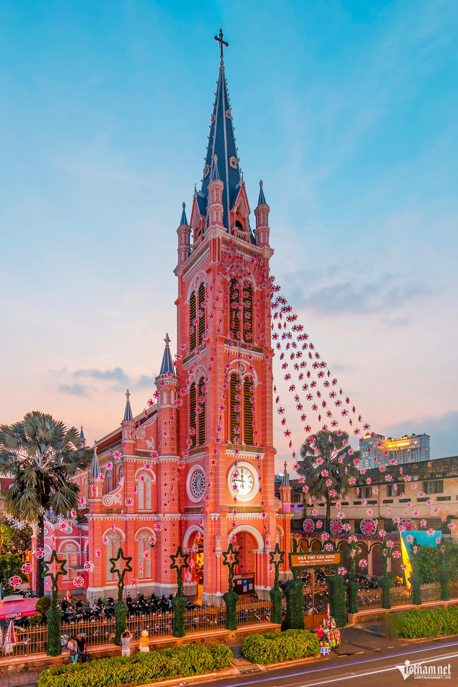 Nhà thờ Tân Định (hay còn gọi là nhà thờ Thánh Tâm Chúa Giêsu) nằm ngay trung tâm TPHCM cũng được trang trí hoa đèn lộng lẫy. Màu hồng nổi bật của nhà thờ cùng nhiều dây đèn rủ bao quanh tạo nên khung cảnh rực rỡ