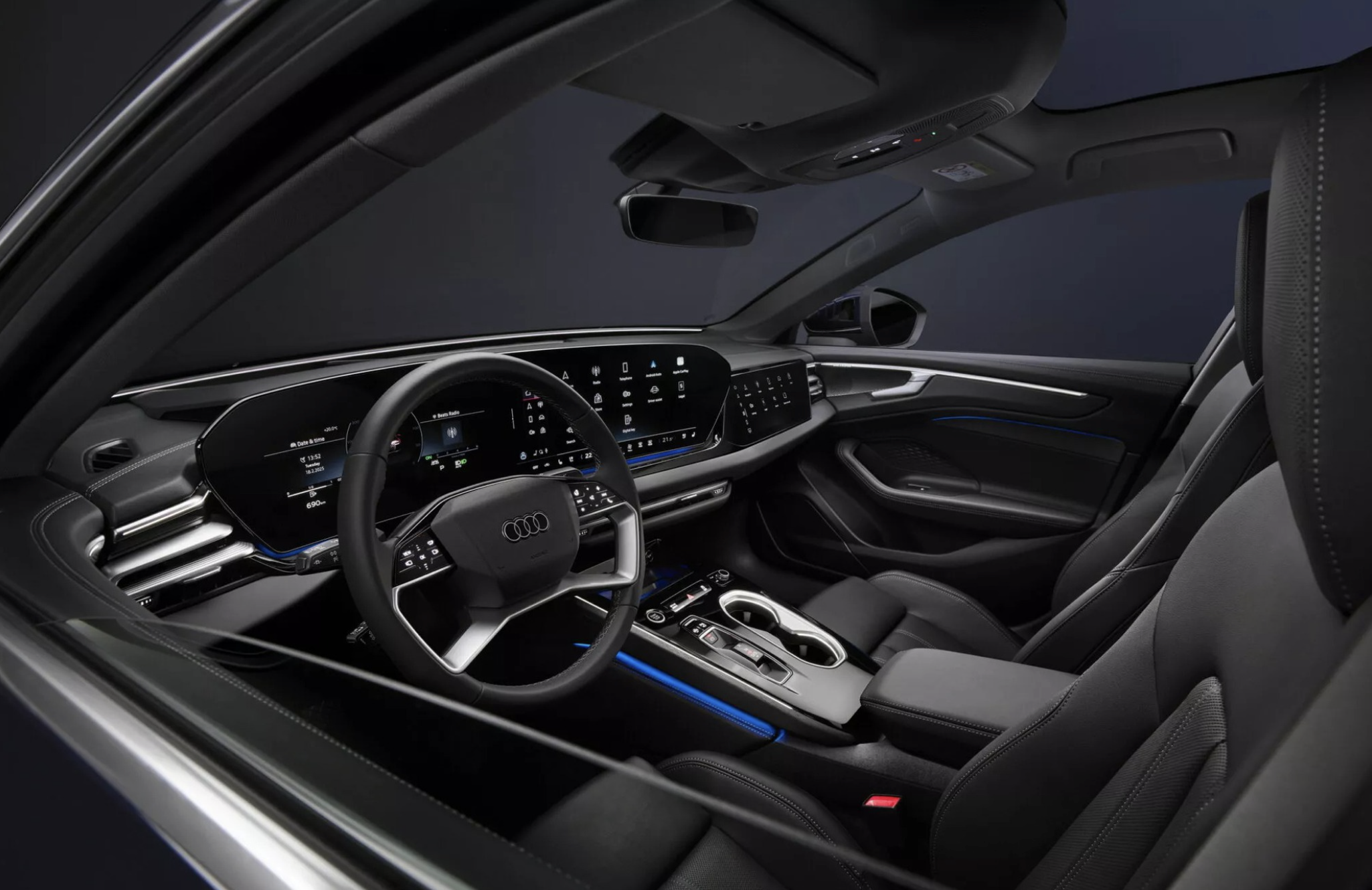 Khoang nội thất Audi A6 2026 gần như giống hệt với mẫu A5. Tại thị trường quốc tế, xe có ba màn hình lớn tại táp lô gồm bảng đồng hồ kỹ thuật số 11,9 inch, màn giải trí trung tâm 14,5 inch và màn giải trí phụ cho người ngồi ghế bên có kích thước 10,9 inch.