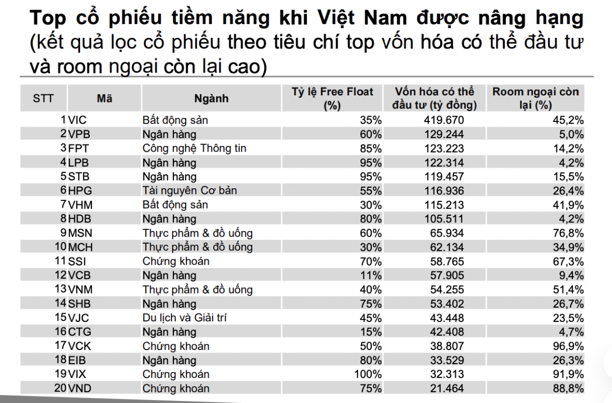 Top cổ phiếu tiềm năng khi Việt Nam được nâng hạng - kết quả lọc cổ phiếu theo tiêu chí top vốn hóa có thể đầu tư và room ngoại còn lại cao gồm: VIC, VPB, LPB, STB, HPG, VHM, HDB, MSN, MCH, SSI, VCB, VNM, SHB, VJC, CTG, VCK, EIB, VIX, VND.