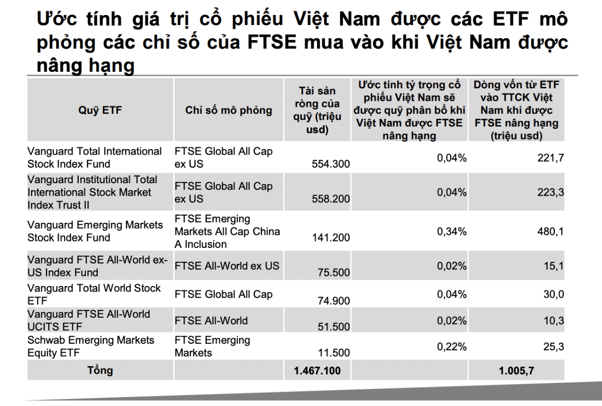 Ước tính giá trị cổ phiếu Việt Nam được các ETF mô phỏng các chỉ số của FTSE mua vào khi Việt Nam được nâng hạng như sau: Vanguard Total International Stock Index Fund mua vào 221,7 triệu USD; Vanguard Institutional Total International Stock Market Index Trust II mua vào 223,3 triệu USD; Vanguard Emerging Markets Stock Index Fund mua vào 480 triệu USD...