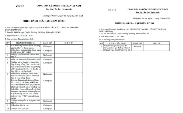 Cụ thể, theo phiếu đánh giá, hậu kiểm ngày 31/12/2025 của Sở Y tế Hà Nội đối với số hồ sơ 250002041/PCBA-HN, công bố ngày 24/9/2025 của Chi nhánh Tây Bắc - Công ty Cổ phần Dược phẩm OPC, các nội dung đánh giá thẩm định đều không đạt bao gồm gồm: Văn bản công bố tiêu chuẩn áp dụng của thiết bị y tế thuộc loại A. Giấy chứng nhận đạt tiêu chuẩn quảnlý chất lượng ISO 13485. Giấy xác nhận đủ điều kiện bảo hành. Tài liệu mô tả tóm tắt kỹ thuật thiếtbị y tế bằng tiếng Việt, kèm theo tài liệu kỹ thuật mô tả chức năng, thôngsố kỹ thuật của thiết bị y tế do chủ sở hữu thiết bị y tế ban hành. Kết quả đánh giá các thông số hóa, lý, vi sinh và các thông số khác docơ sở đủ điều kiện theo quy định của pháp luật về đánh giá sự phù hợp cấp hoặc Giấy chứng nhận đánh giá chất lượng do cơ quan có thẩm quyền của Việt Nam cấp đối với TBYT chẩn đoán in vitro (TBYT sản xuất trong nước). Mẫu nhãn thiết bị y tế...