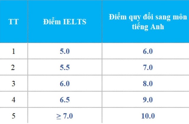 Bảng quy định về quy đổi điểm chứng chỉ IELTS thành điểm môn tiếng Anh.