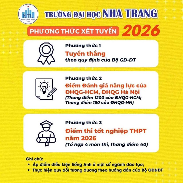 Tại Trường Đại học Nha Trang, kế hoạch tuyển sinh dự kiến cho năm 2026 giữ ổn định số lượng gần 3.800 chỉ tiêu cho 71 chương trình đào tạo. Nhà trường tiếp tục không xét tuyển học bạ và không cộng điểm ưu tiên đối với chứng chỉ IELTS nhằm bảo đảm sự công bằng giữa các nhóm thí sinh.