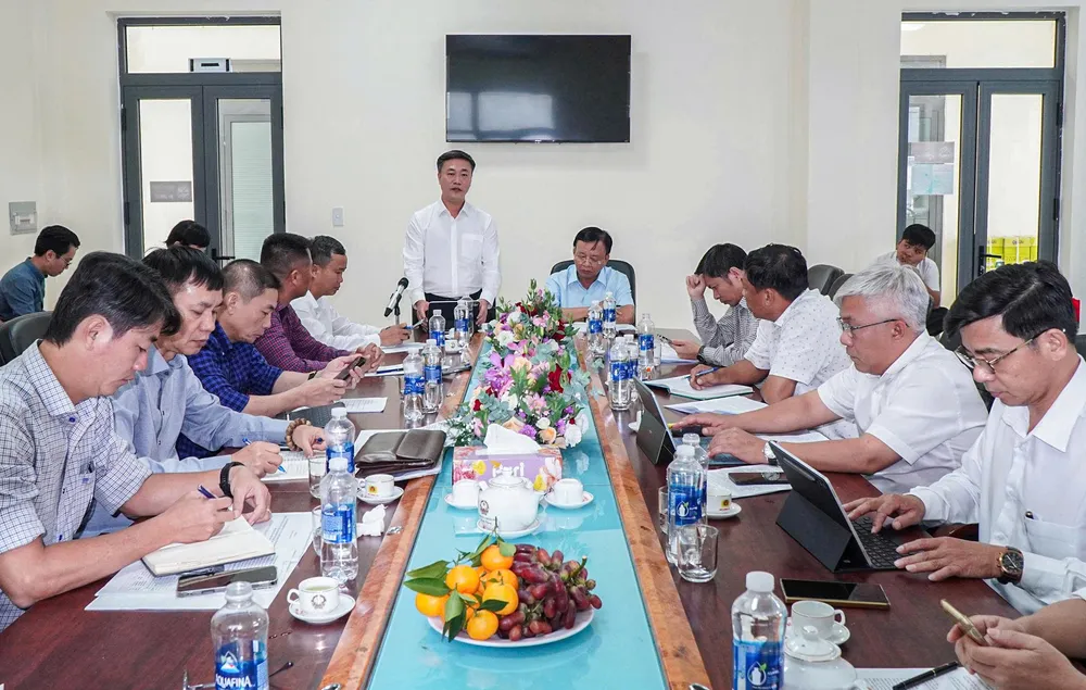 Ông Nguyễn Việt Hùng (đứng) yêu cầu các nhà thầu đẩy nhanh thủ tục, thi công trạm dừng nghỉ, hoàn thành vào 1-1-2026. Ảnh: XUÂN HOÁT