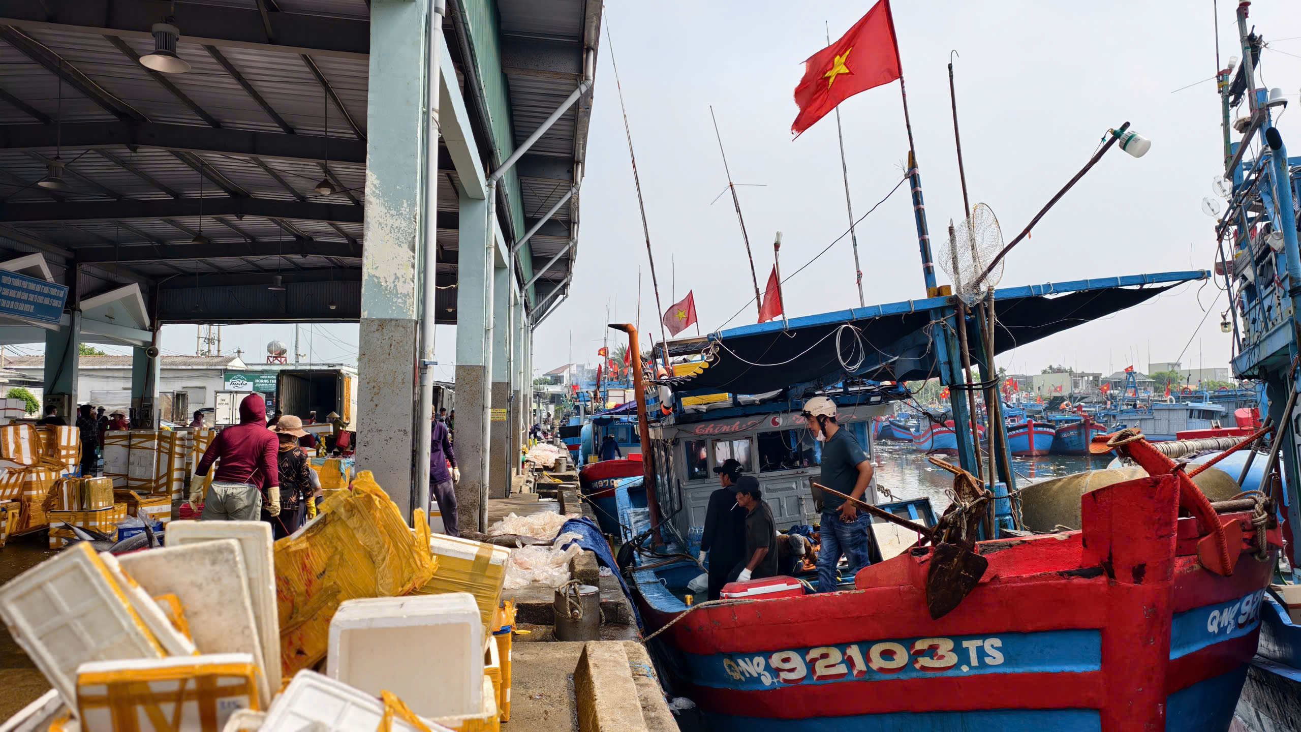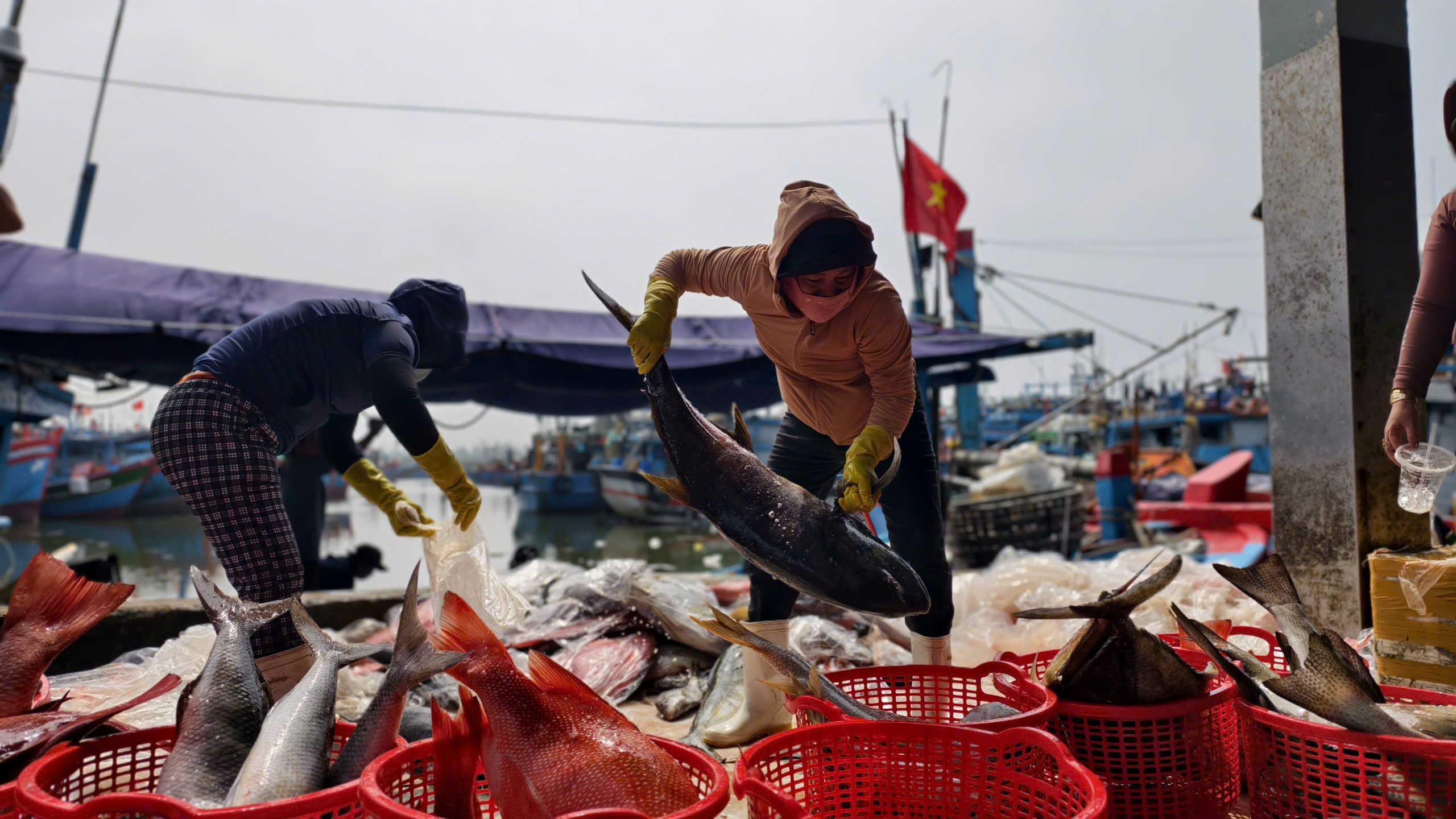 Những khoang cá đầy ắp được khẩn trương bốc dỡ lên bờ, mang theo niềm vui của ngư dân, nhưng cũng xen lẫn không ít nỗi lo trong bối cảnh giá nhiên liệu tăng cao.