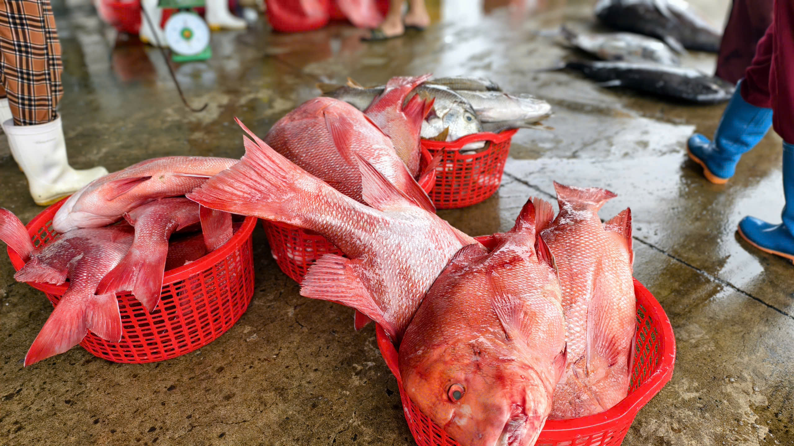 Ngay khi con tàu vừa cập cảng, nhiều thương lái đã chờ sẵn. Hàng tấn cá tươi đủ loại được lần lượt chuyển lên bờ trong niềm phấn khởi của các ngư dân.