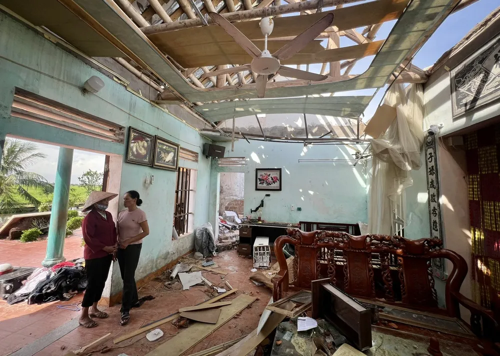 Trong căn nhà xiêu vẹo còn sót lại sau trận lốc xoáy, bà Nguyễn Thị Tuyết đứng lặng, đôi mắt đỏ ngầu, trống rỗng, ngơ ngác nhìn đống đổ nát trước mặt.
