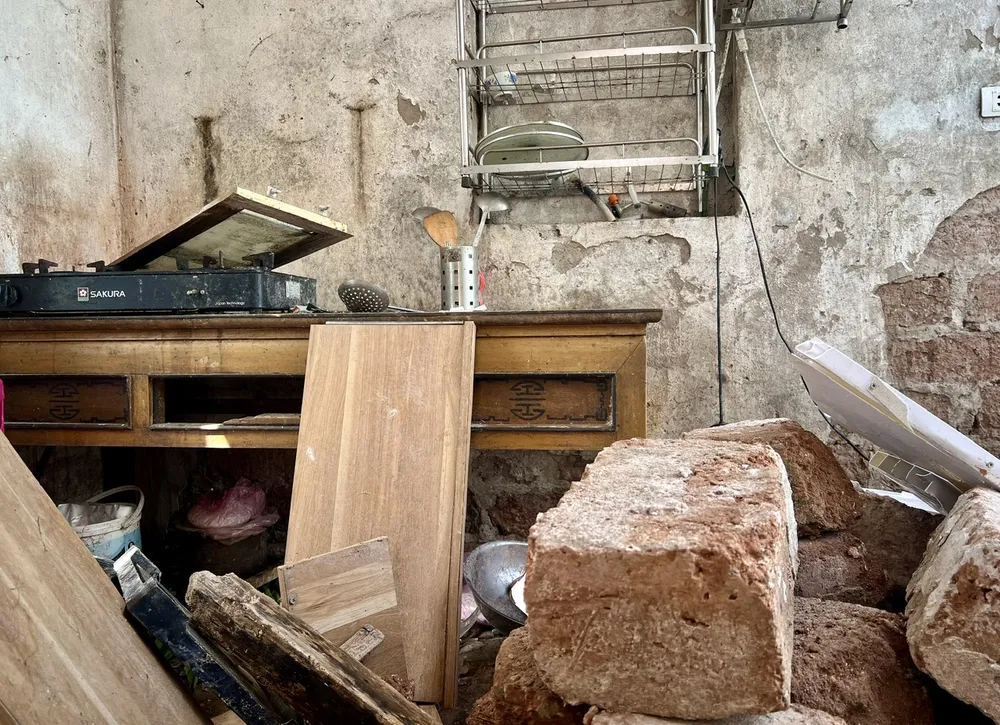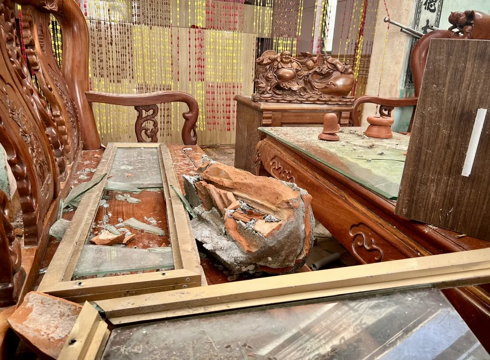 Bên trong nhà, bàn thờ tổ tiên bị xô lệch, hoành phi câu đối còn treo nhưng nghiêng ngả. Gạch ngói, mảnh kính vỡ vụn, trộn lẫn đất, vữa, ngổn ngang khắp ba gian. Chiếc giường gỗ - nơi vợ chồng bà nằm ngủ đêm trước - gãy sập vài thanh ngang, nghiêng lệch, nhuốm đầy bụi và vụn ngói.