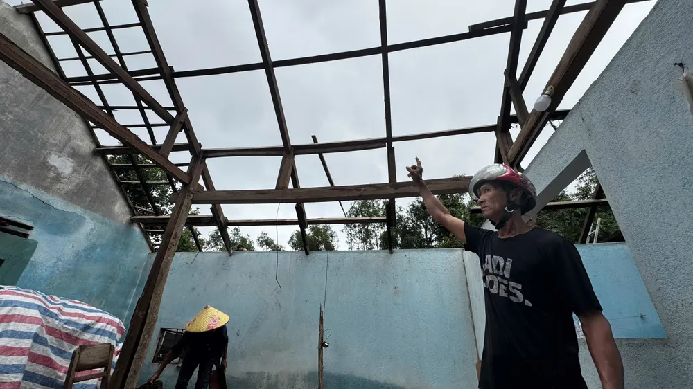 Bà Muốn bày tỏ, mong cơ quan chức năng giúp đỡ người dân sớm ổn định cuộc sống, sửa nhà để che nắng che mưa. Trong ảnh: Căn nhà của bà Muốn trơ mái sau trận lốc.