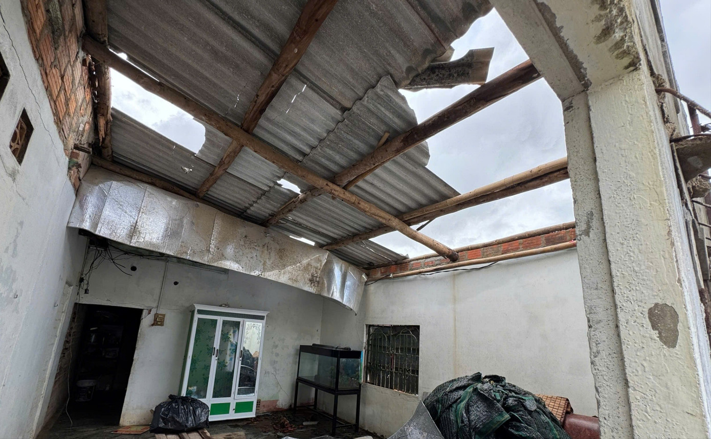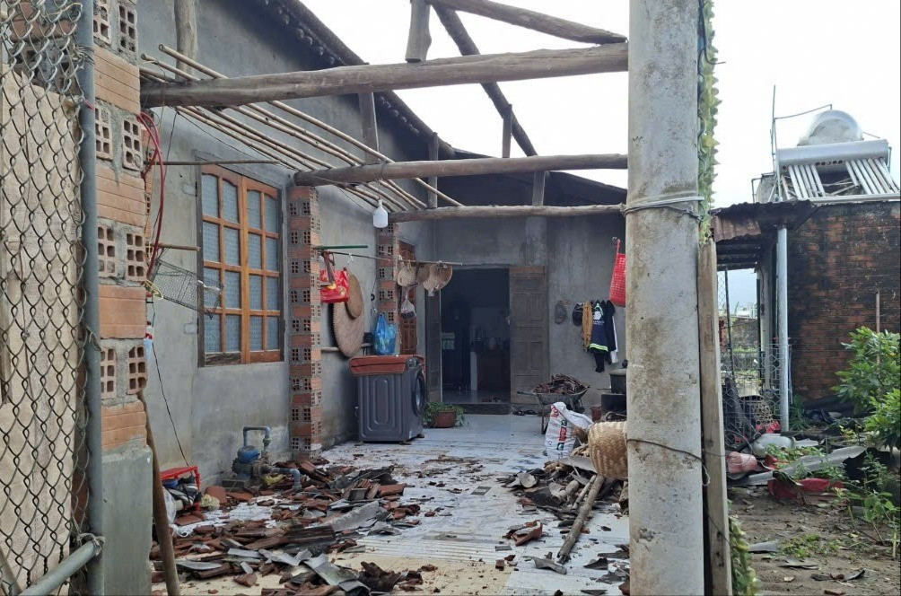 “Tôi đang ngủ thì nghe tiếng gió rít kinh hoàng quét qua ngôi nhà. Sau đó là tiếng tôn bay lẻng xẻng, tiếng ngói rơi lộp độp, tôi bật dậy kiểm tra thì chứng kiến nguyên mái nhà trên bị tốc mái hoàn toàn, nhiều miếng ngói ở phần mái phòng khách cũng bị cuốn bay”, bà Cúc kể.