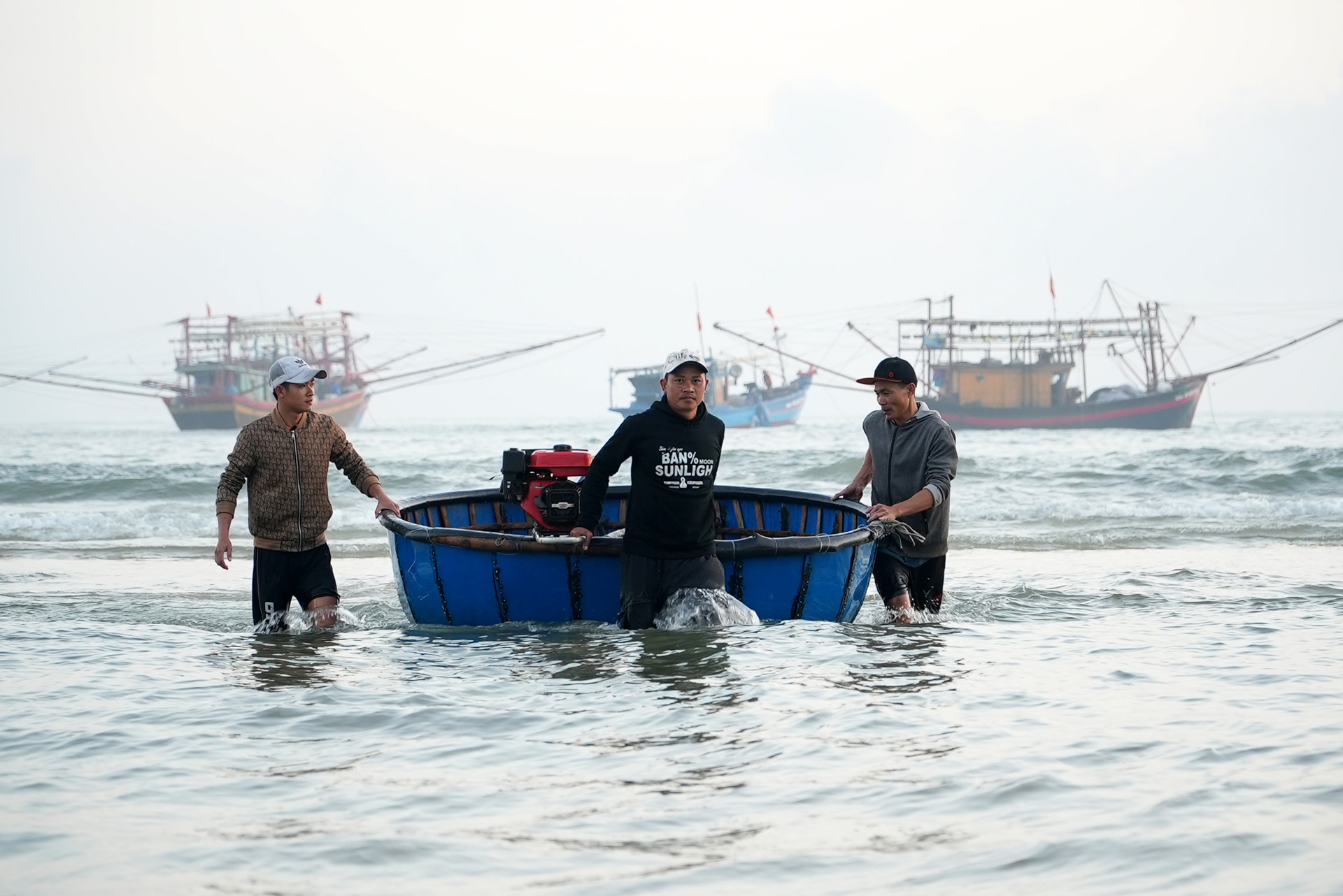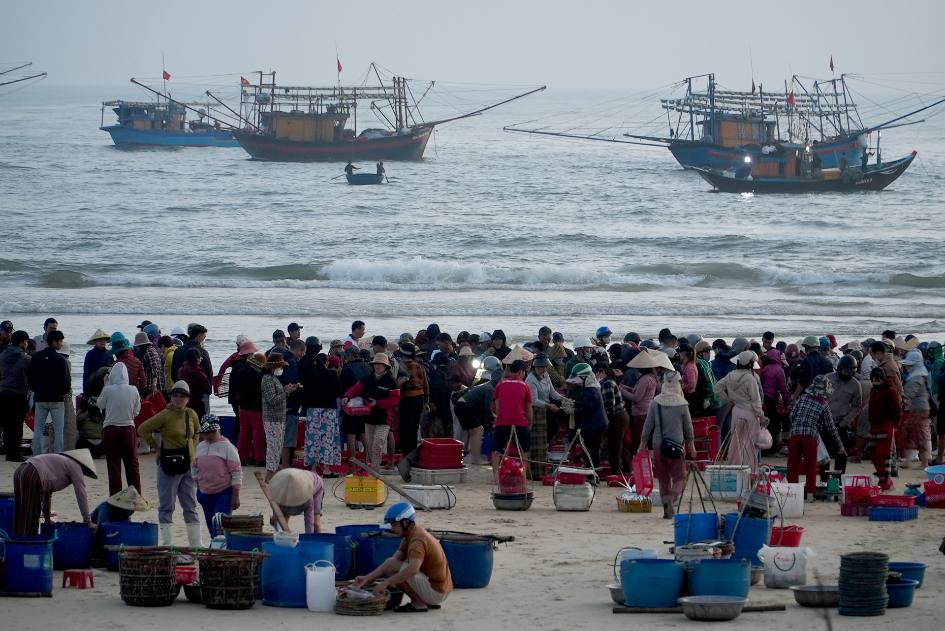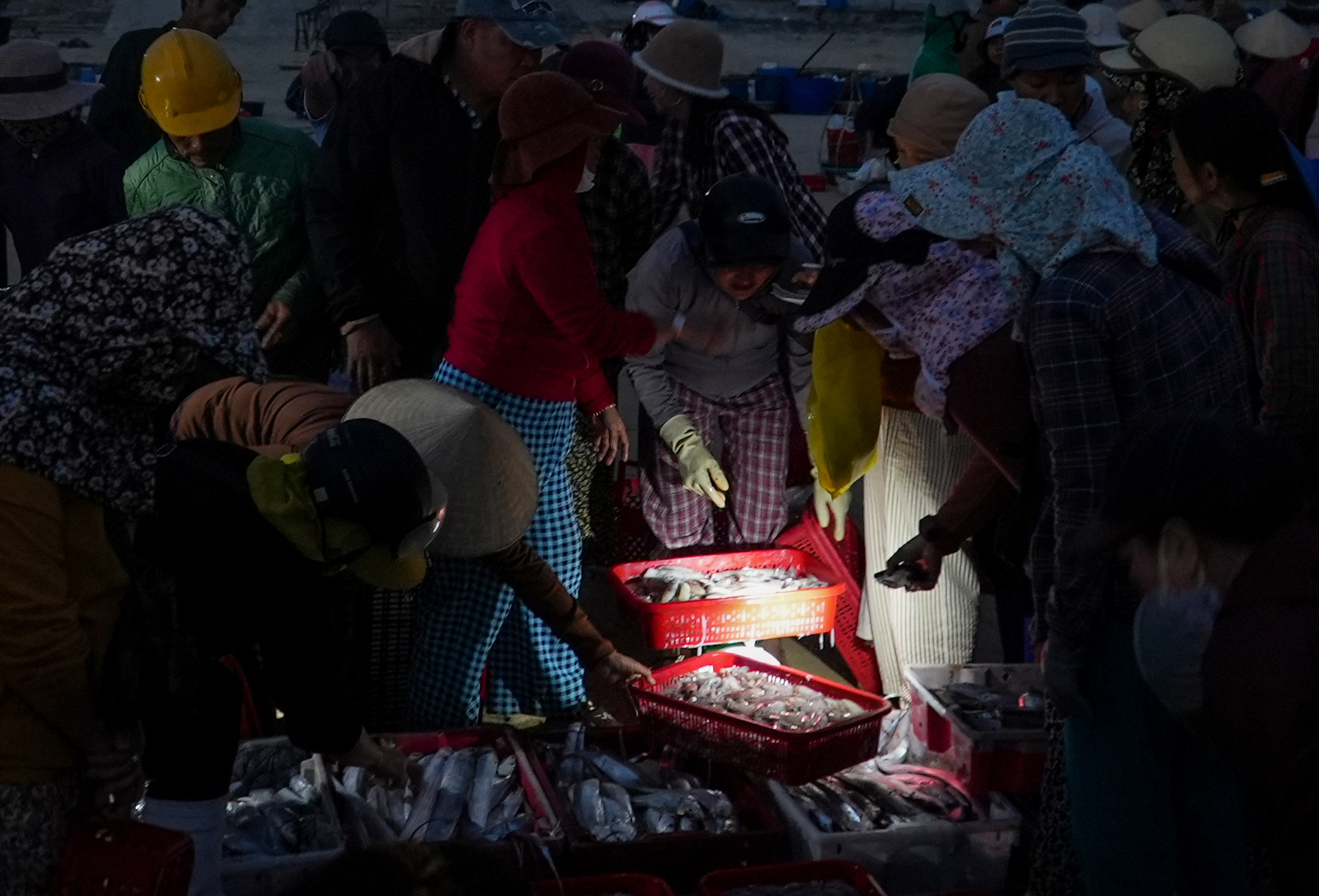Những mẻ cá tươi rói nhanh chóng được phân loại, bốc dỡ, đưa lên bờ tiêu thụ. Trên bến, thương lái tất bật thu mua, tạo nên khung cảnh lao động khẩn trương, rộn ràng phấn khởi.