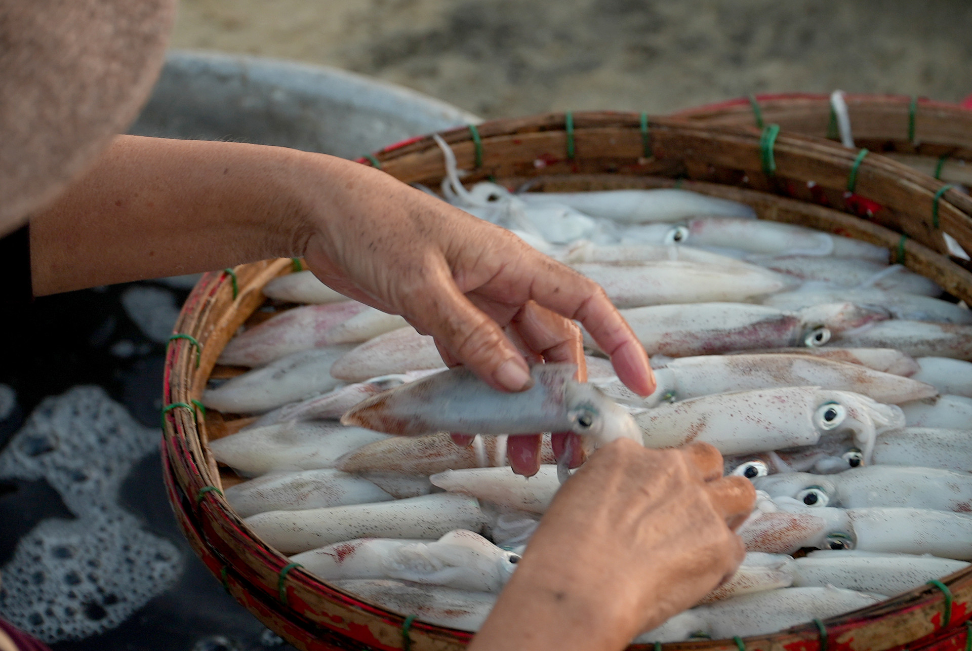 Những khay mực tươi rói đầu tiên cập bờ. Ảnh: HỒ QUÂN