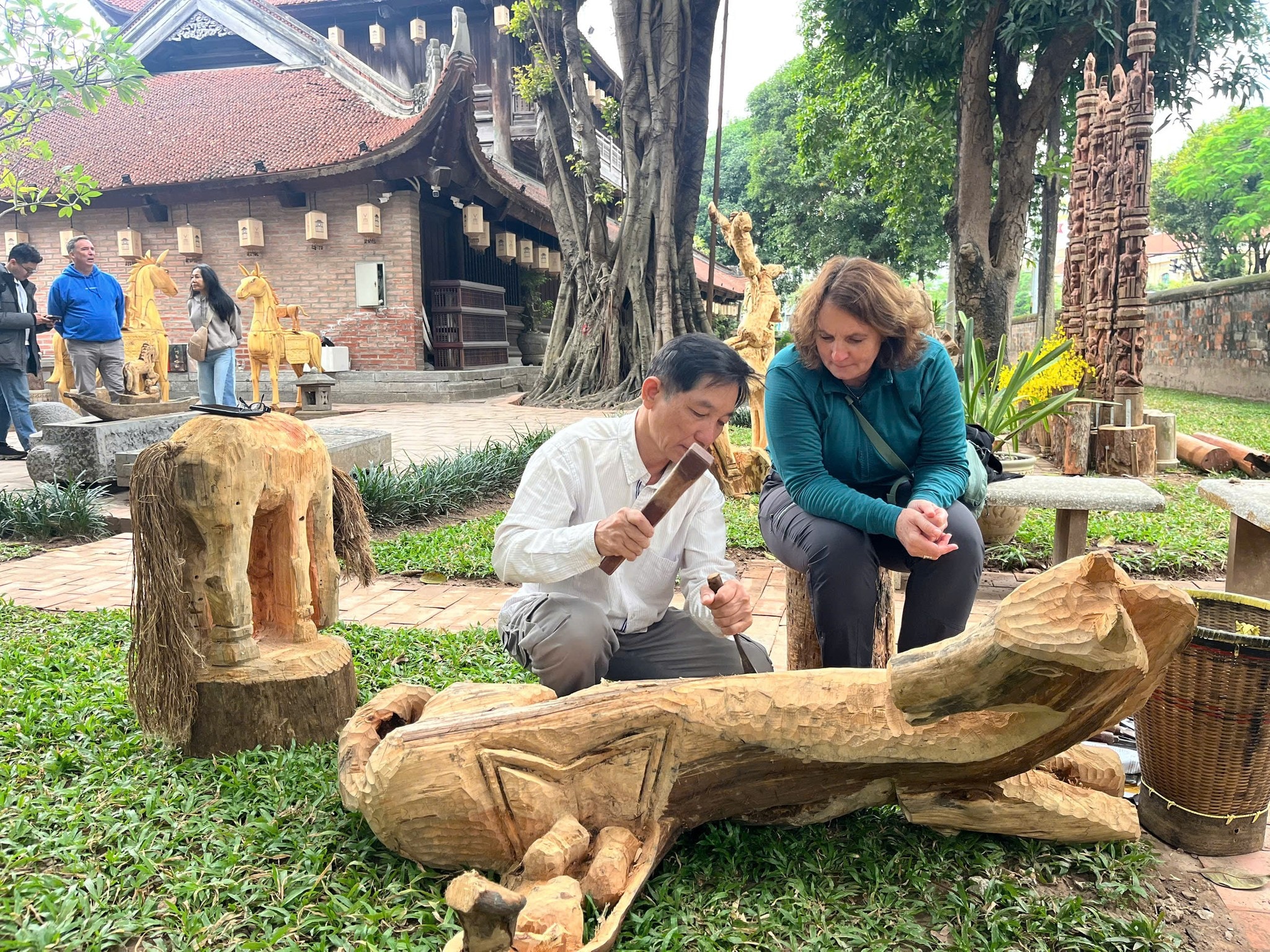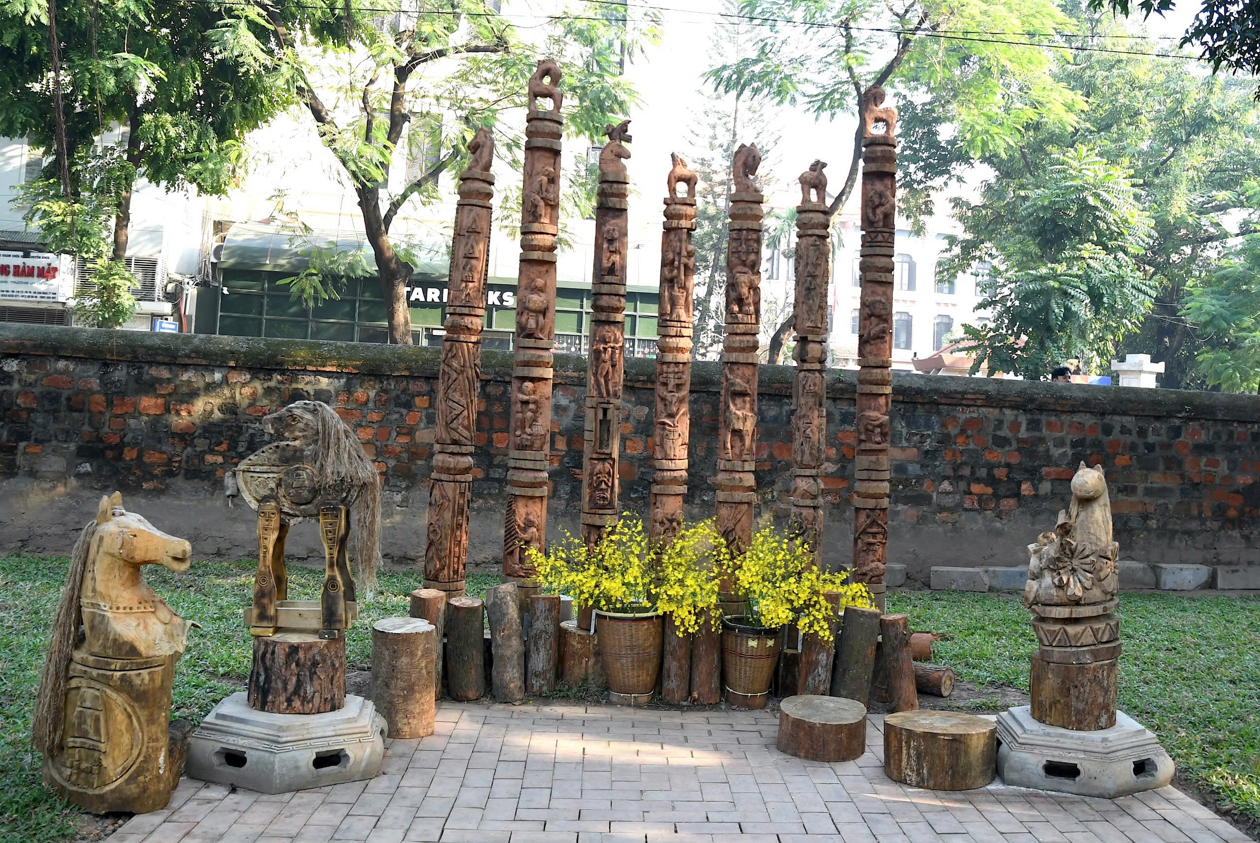 Nhà nghiên cứu Đặng Minh Tâm thực hiện chế tác tượng gỗ trong không gian trưng bày "Ngựa về phố" tại Văn Miếu