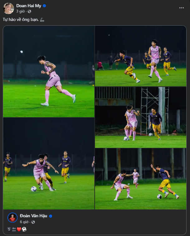 Nhưng giữa hàng nghìn lời chúc, dòng trạng thái của Doãn Hải My - vợ Đoàn Văn Hậu – lại khiến cộng đồng mạng đặc biệt chú ý. Cô chia sẻ lại bài đăng của chồng, kèm theo dòng chữ giản dị mà đầy ý nghĩa: “Tự hào về ông bạn.” Chỉ năm chữ ngắn ngủi, nhưng chứa đựng tất cả tình yêu, sự đồng hành và niềm tự hào mà cô dành cho người bạn đời của mình.
