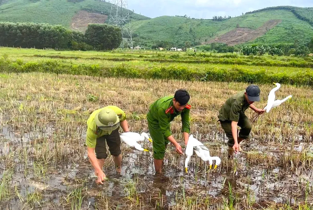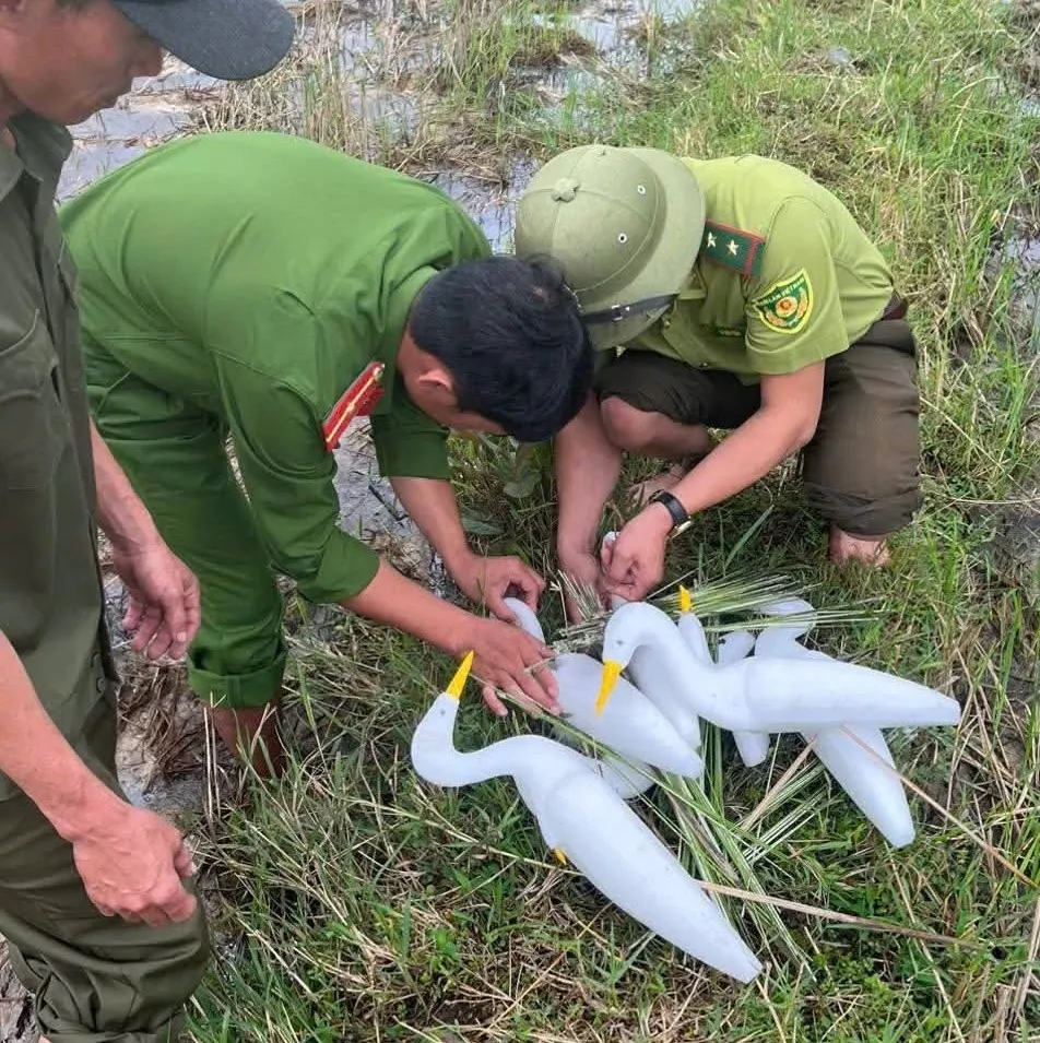Trước đó, qua kiểm tra tại khu vực đồng ruộng bản Cửa Mẹc, lực lượng chức năng phát hiện nhiều người lợi dụng việc nhiều đàn chim bay về tránh trú mưa bão đã đưa cò giả mồi, que bẫy để săn bắt chim trời.