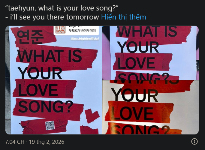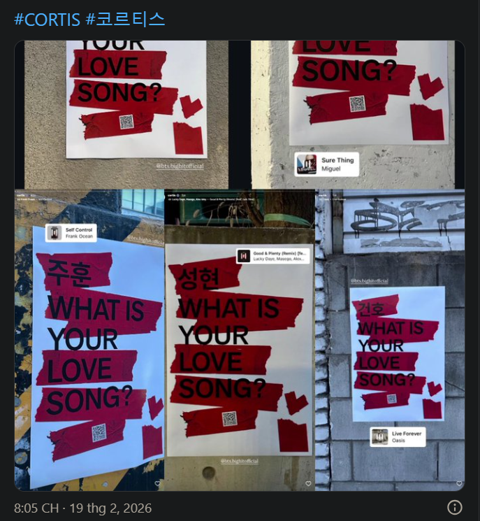 Đáng chú ý, hai nhóm nhạc đàn em của BTS trực thuộc BigHit và tập đoàn HYBE là TXT và CORTIS cũng tham gia chiến dịch khi lần lượt chia sẻ “bài hát tình yêu” của riêng mình trên Instagram. Động thái này lập tức làm dấy lên nhiều suy đoán trong cộng đồng mạng.