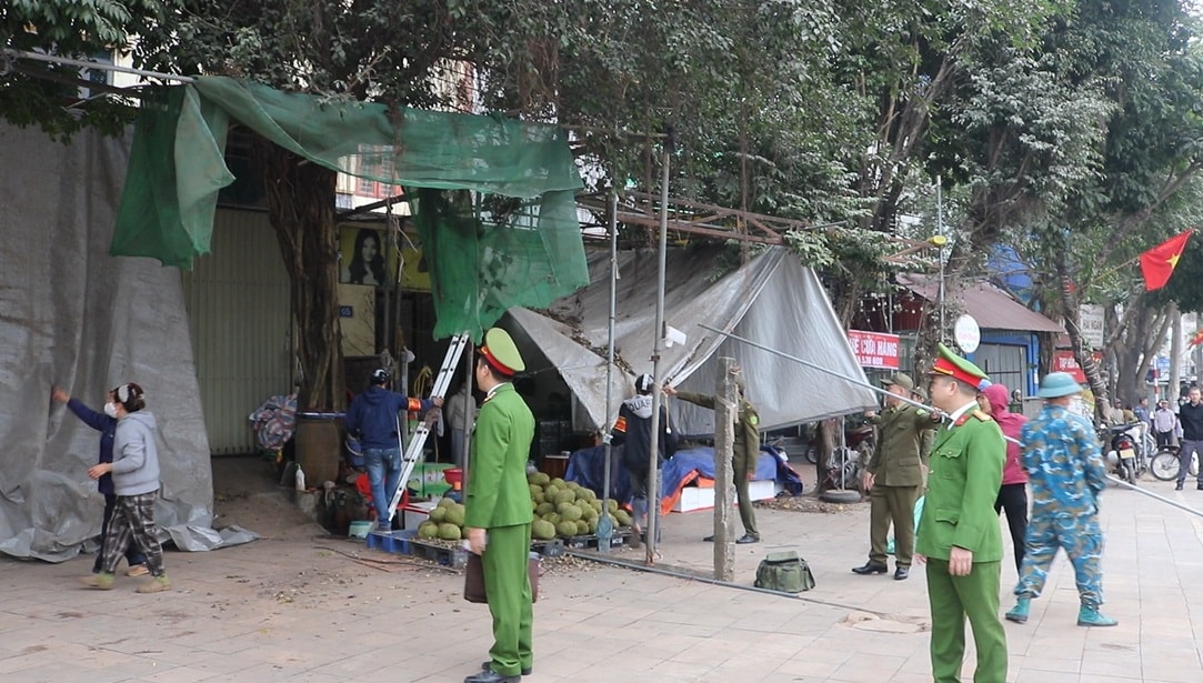 Lực lượng chức năng xã Mỹ Đức hỗ trợ người dân tháo dỡ các mái che, mái vẩy sai quy định tại khu vực đầu cầu Tế Tiêu. Ảnh: ST