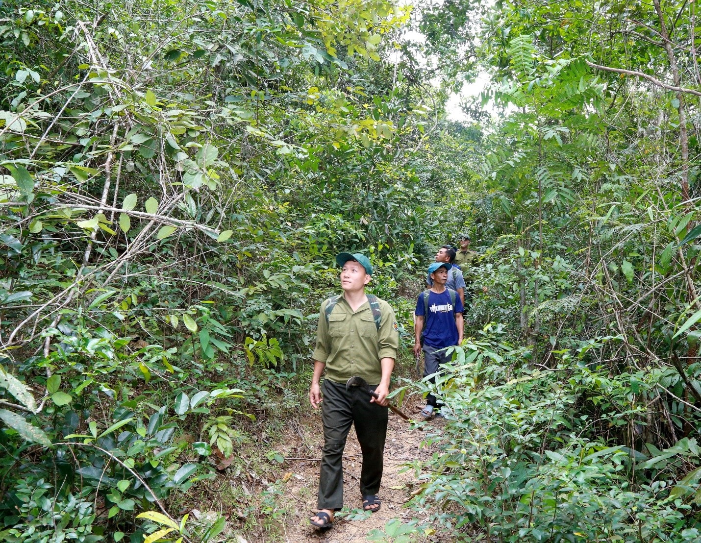 Hộ dân xã Cam Hiệp cùng lực lượng của Trạm Quản lý, bảo vệ rừng tuần tra một khu vực rừng giao khoán.
