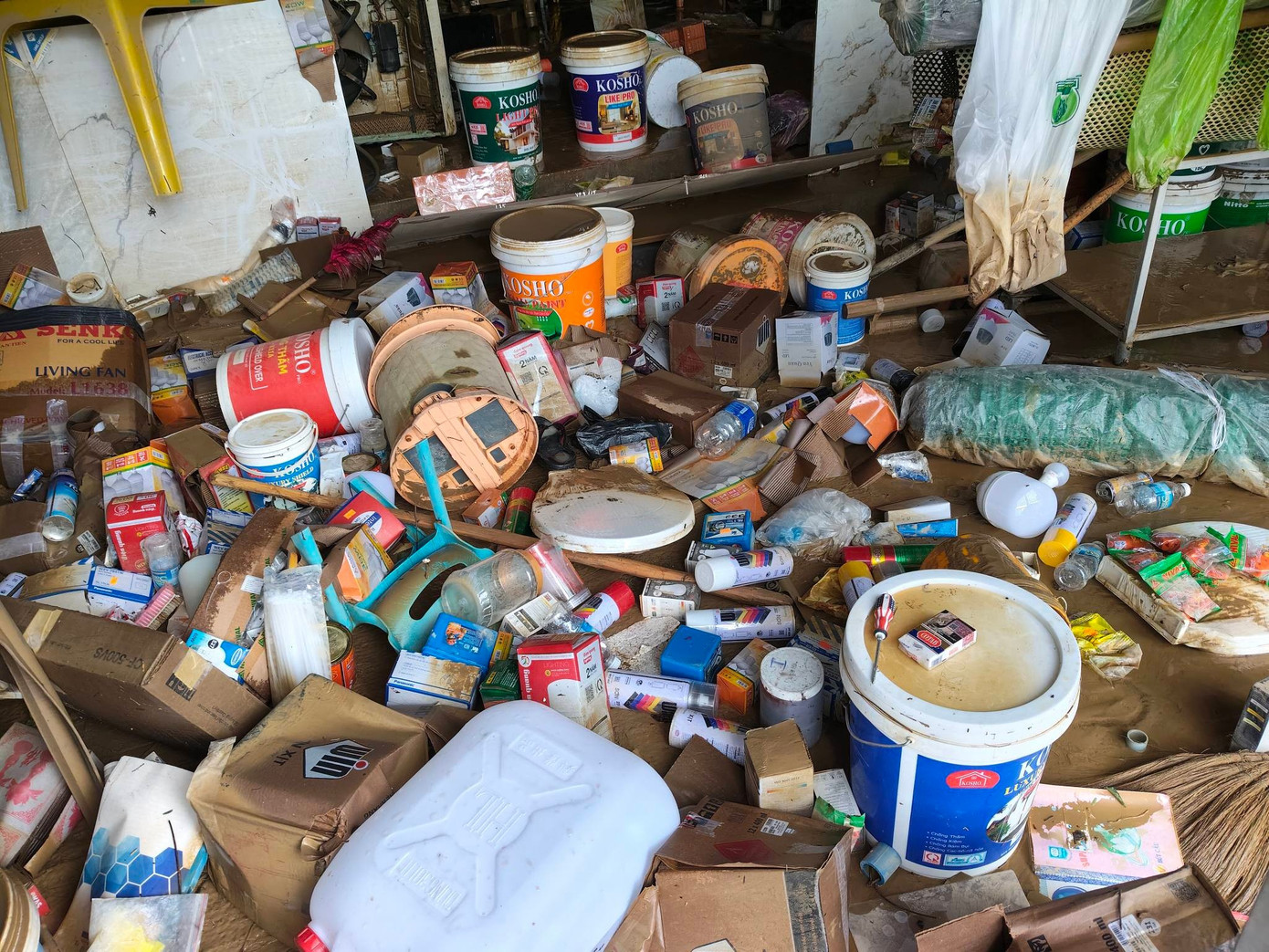 Cửa hàng của gia đình anh Nhất tan hoang sau lũ.